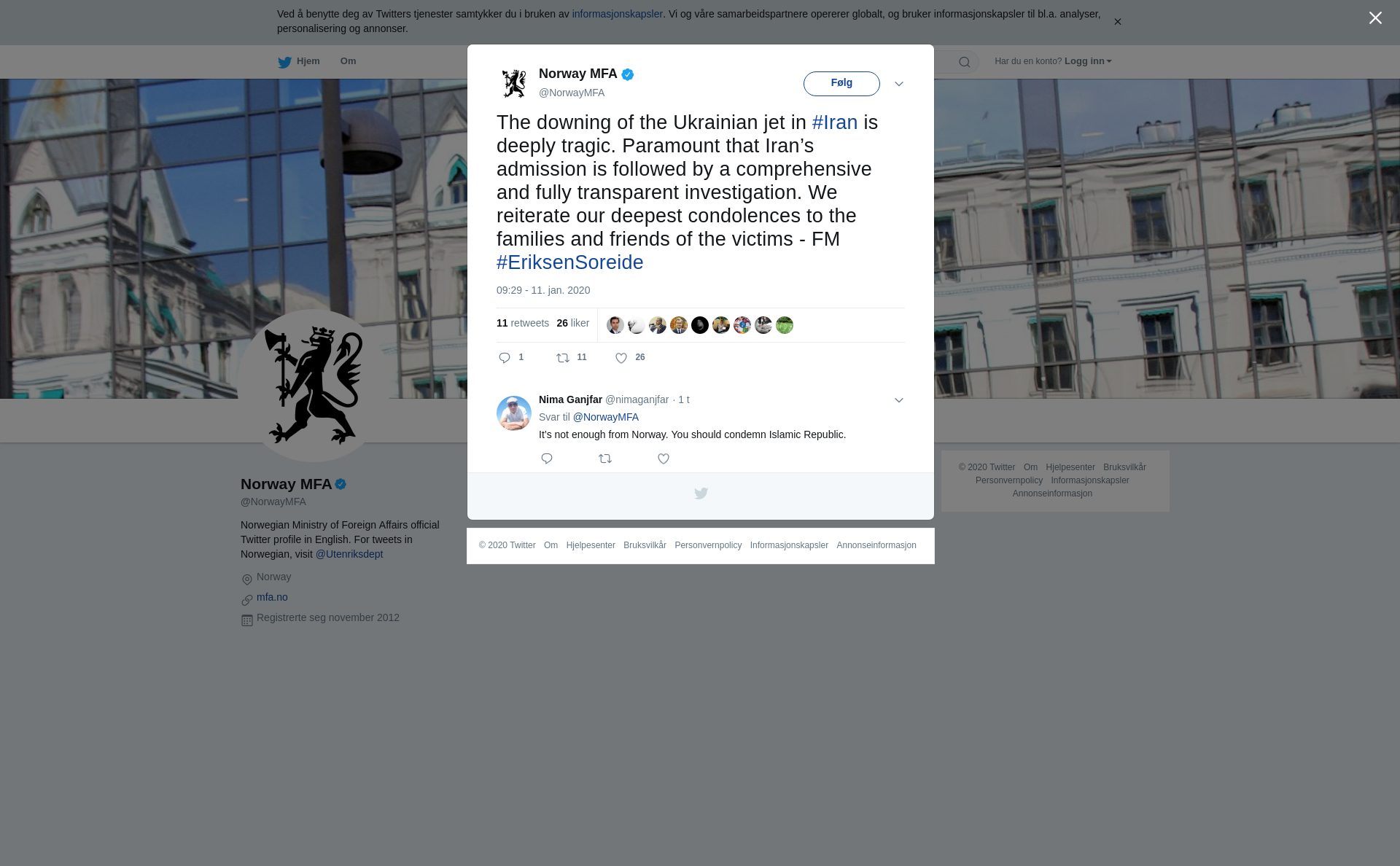 The downing of the Ukrainian jet in #Iran is deeply tragic. Paramount that Iran’s admission is followed by a comprehensive and fully transparent investigation. We reiterate our deepest condolences to the families and friends of the victims - FM #EriksenSoreide