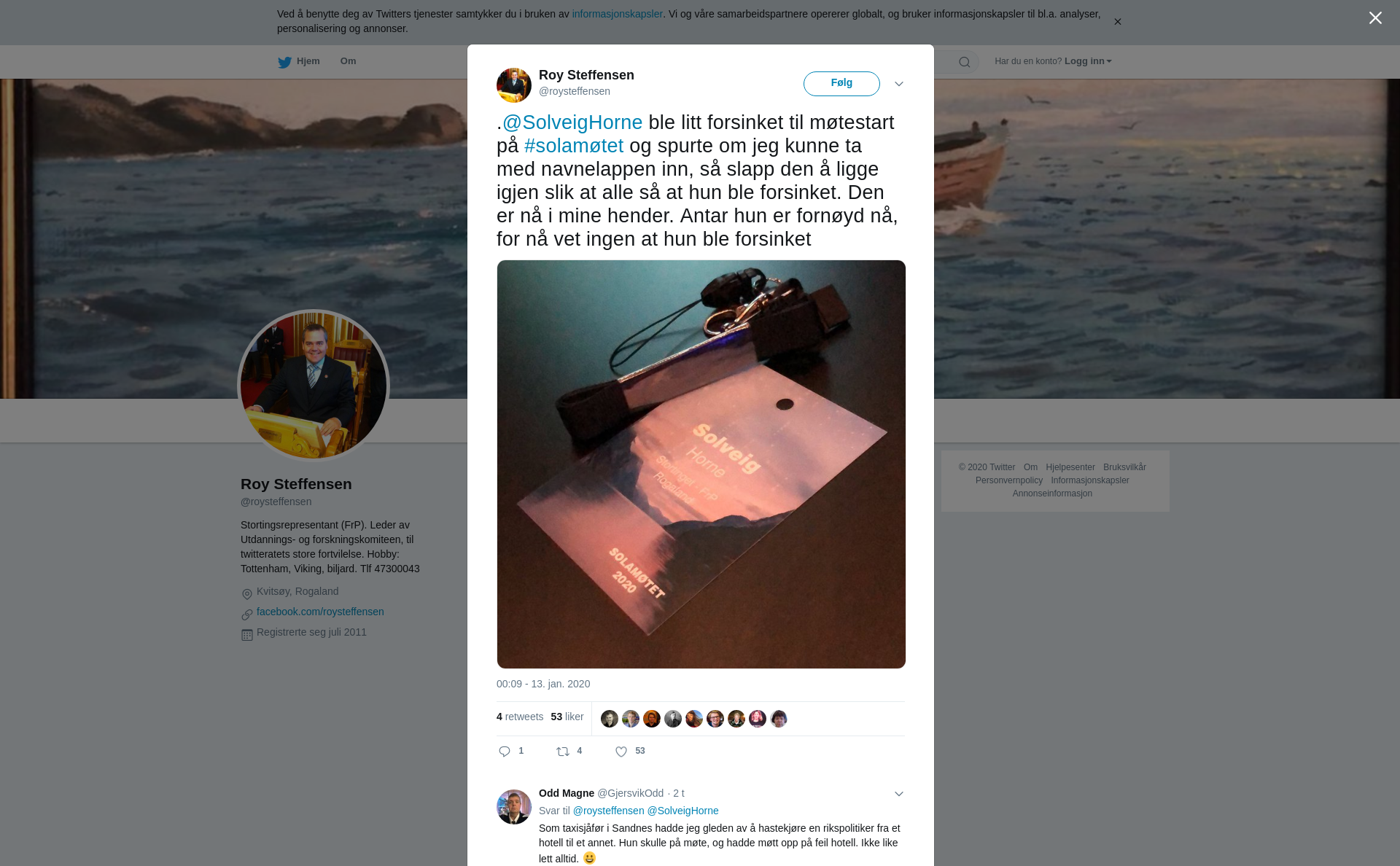 .@SolveigHorne ble litt forsinket til møtestart på #solamøtet og spurte om jeg kunne ta med navnelappen inn, så slapp den å ligge igjen slik at alle så at hun ble forsinket. Den er nå i mine hender. Antar hun er fornøyd nå, for nå vet ingen at hun ble forsinket https://t.co/oN9YGPDFAQ