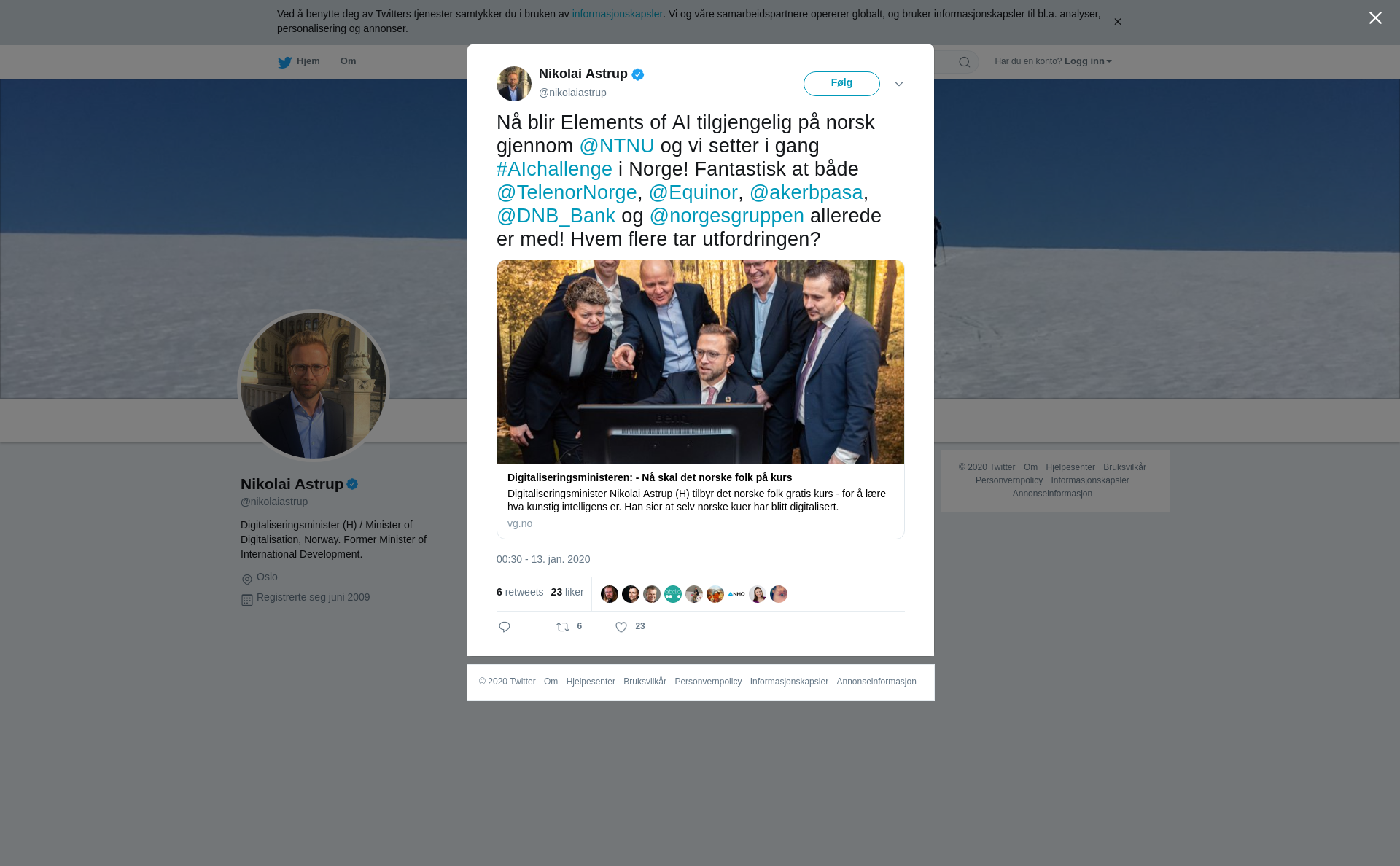 Nå blir Elements of AI tilgjengelig på norsk gjennom @NTNU og vi setter i gang #AIchallenge i Norge! Fantastisk at både @TelenorNorge, @Equinor, @akerbpasa, @DNB_Bank og @norgesgruppen allerede er med! Hvem flere tar utfordringen? https://t.co/GOm4zLMY94