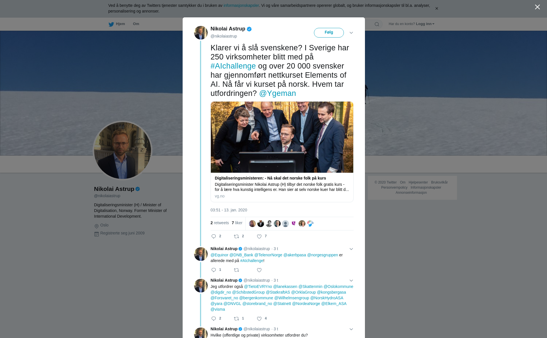 Klarer vi å slå svenskene? I Sverige har 250 virksomheter blitt med på #AIchallenge og over 20 000 svensker har gjennomført nettkurset Elements of AI. Nå får vi kurset på norsk. Hvem tar utfordringen? @Ygeman https://t.co/GOm4zLMY94
