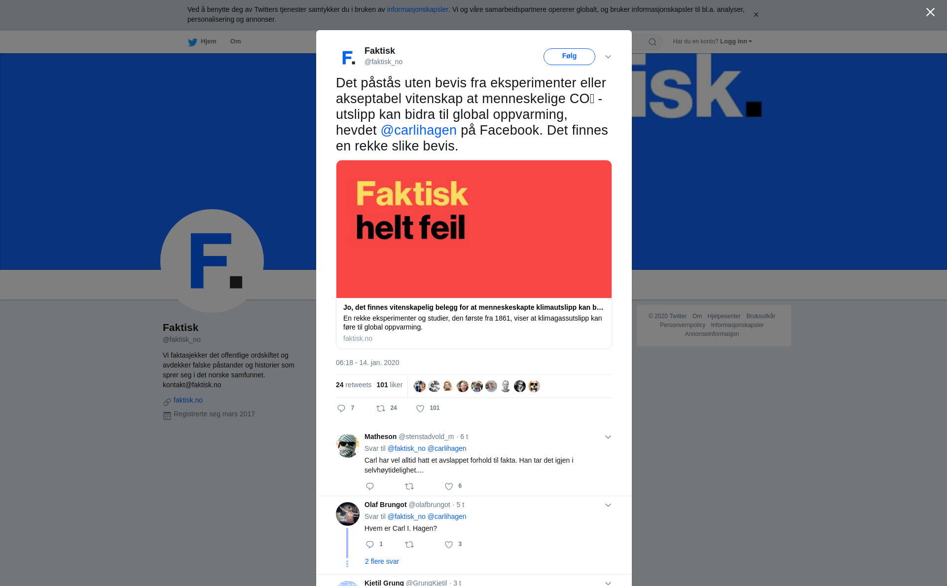 RT @faktisk_no: Det påstås uten bevis fra eksperimenter eller akseptabel vitenskap at menneskelige CO₂-utslipp kan bidra til global oppvarming, hevdet @carlihagen på Facebook. Det finnes en rekke slike bevis.