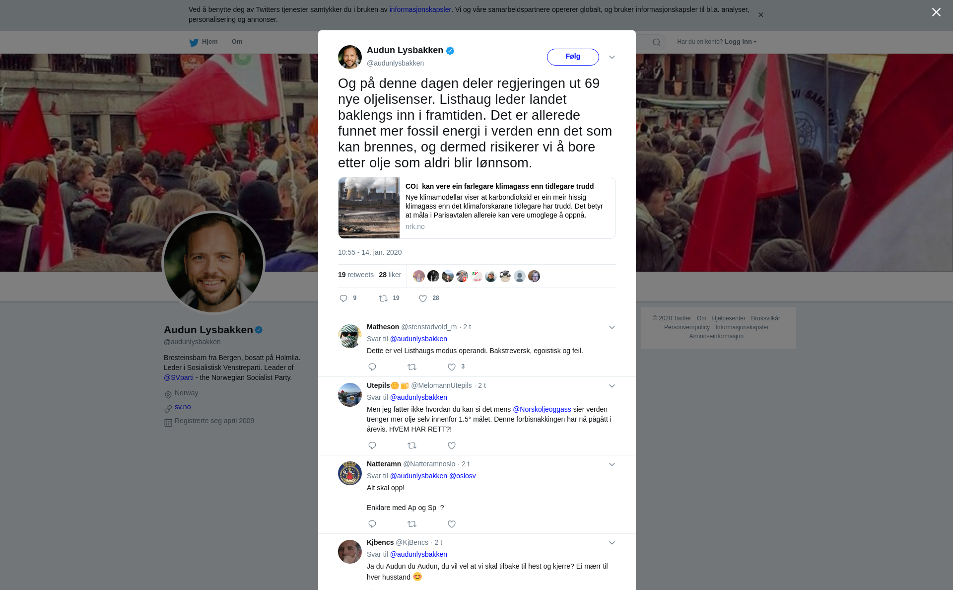 RT @audunlysbakken: Og på denne dagen deler regjeringen ut 69 nye oljelisenser. Listhaug leder landet baklengs inn i framtiden. Det er allerede funnet mer fossil energi i verden enn det som kan brennes, og dermed risikerer vi å bore etter olje som aldri blir lønnsom. https://t.co/Y4cvuQ7WJM