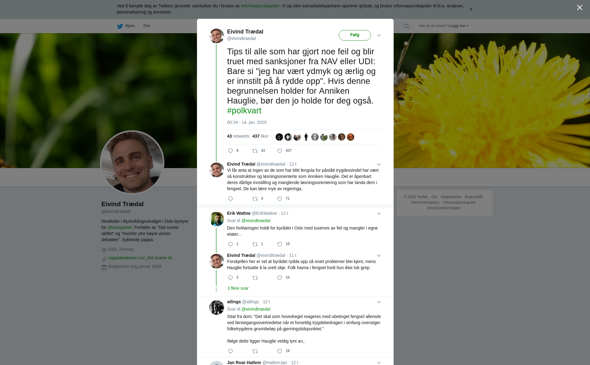 RT @eivindtraedal: Tips til alle som har gjort noe feil og blir truet med sanksjoner fra NAV eller UDI: Bare si "jeg har vært ydmyk og ærlig og er innstilt på å rydde opp". Hvis denne begrunnelsen holder for Anniken Hauglie, bør den jo holde for deg også. #polkvart