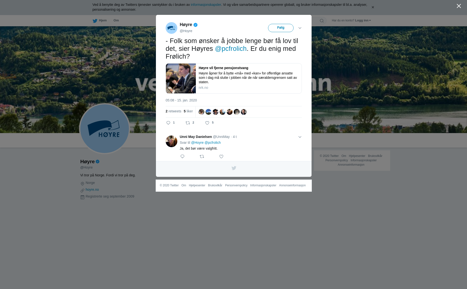 - Folk som ønsker å jobbe lenge bør få lov til det, sier Høyres @pcfrolich. Er du enig med Frølich? https://t.co/FHFV6Bi7Cq