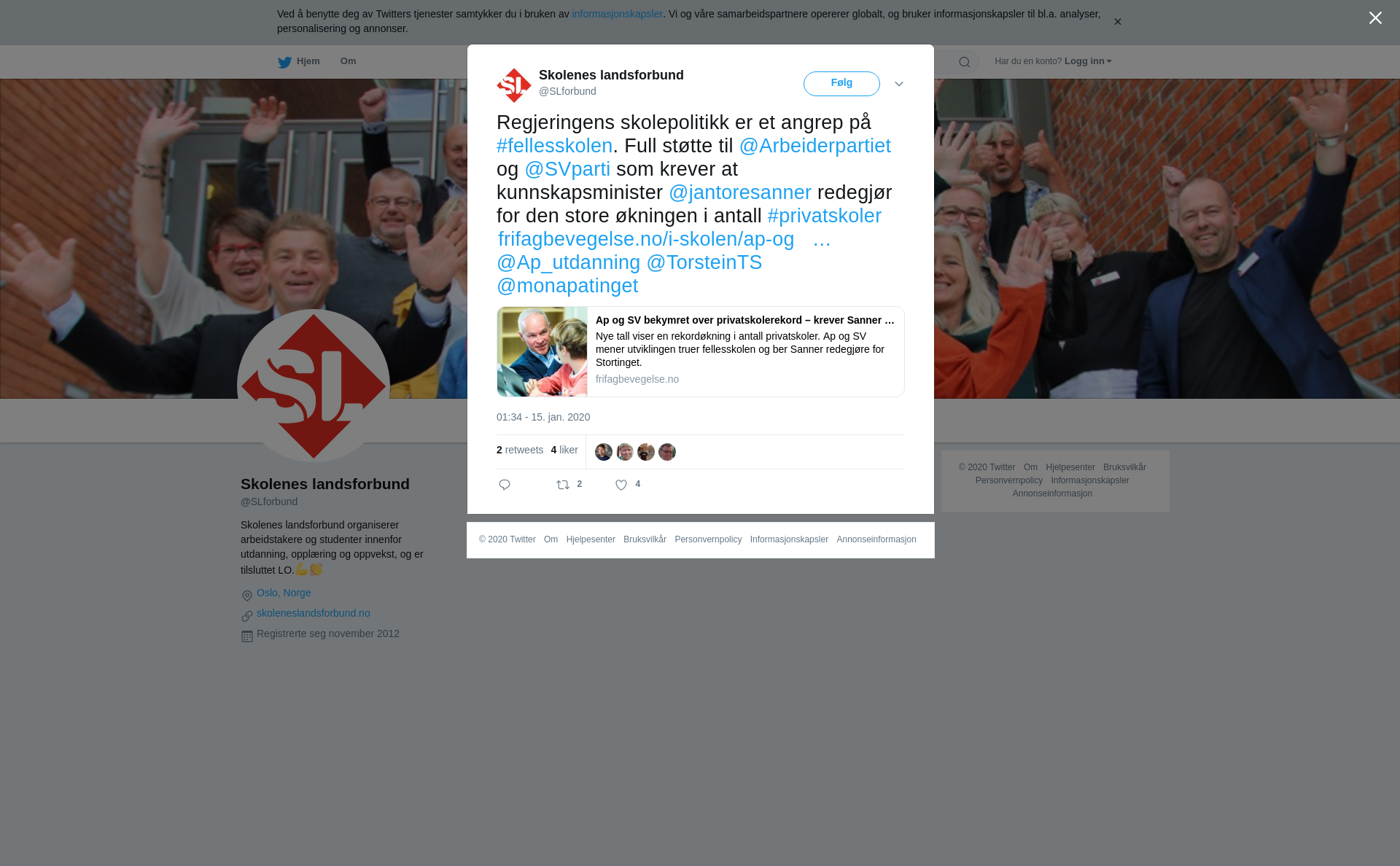 RT @SLforbund: Regjeringens skolepolitikk er et angrep på #fellesskolen. Full støtte til @Arbeiderpartiet og @SVparti som krever at kunnskapsminister @jantoresanner redegjør for den store økningen i antall #privatskoler https://t.co/s3wSRP1ctY @Ap_utdanning @TorsteinTS @monapatinget