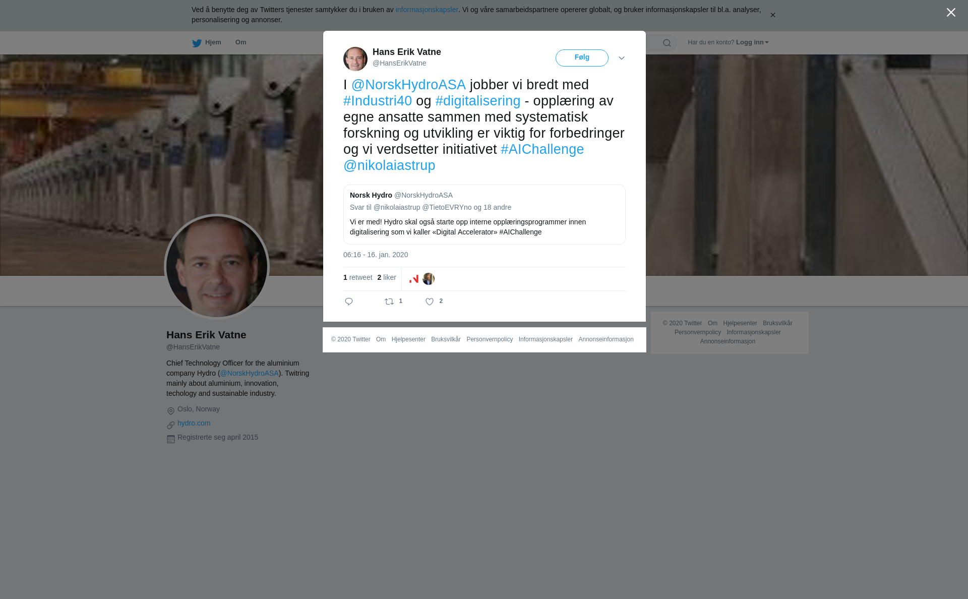 RT @HansErikVatne: I @NorskHydroASA jobber vi bredt med #Industri40 og #digitalisering - opplæring av egne ansatte sammen med systematisk forskning og utvikling er viktig for forbedringer og vi verdsetter initiativet #AIChallenge @nikolaiastrup