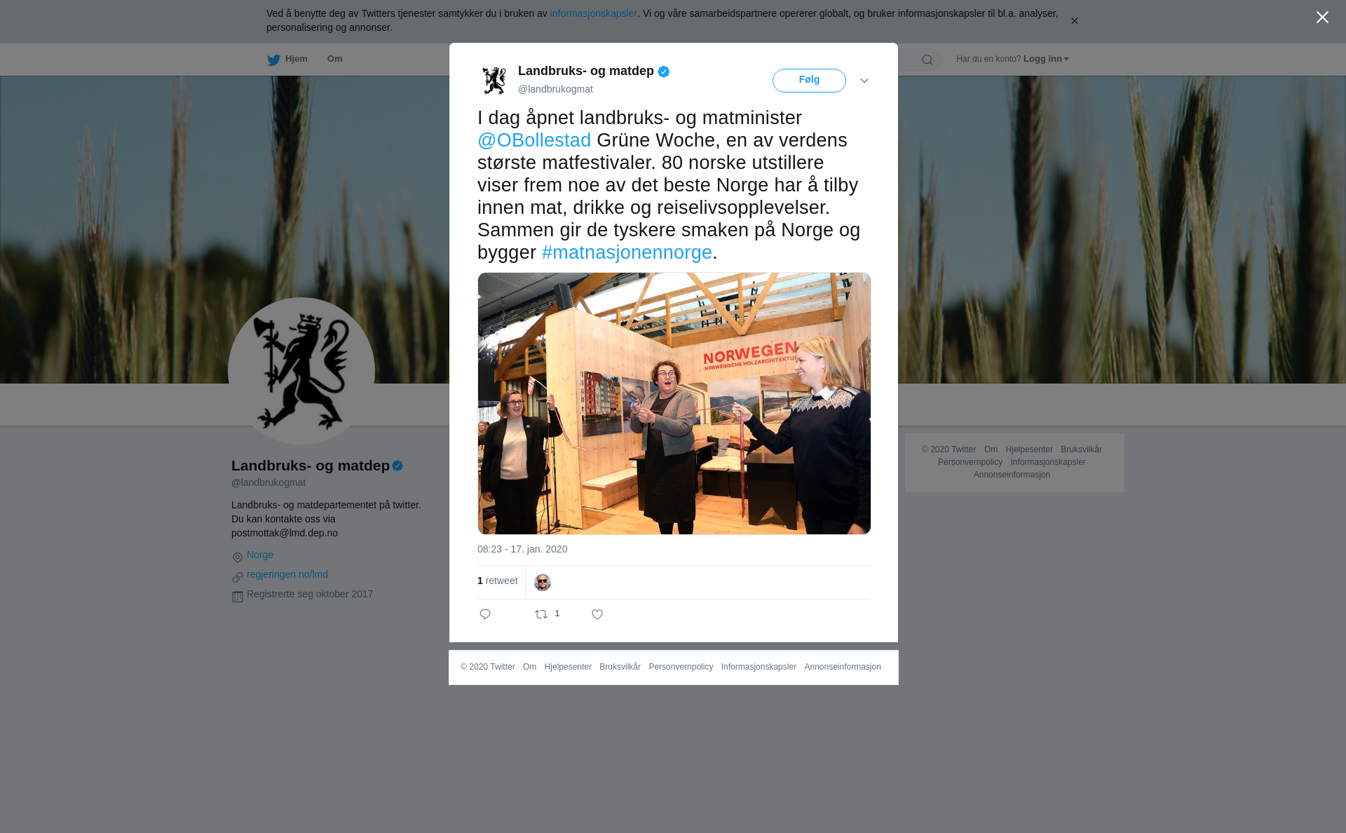 I dag åpnet landbruks- og matminister @OBollestad Grüne Woche, en av verdens største matfestivaler. 80 norske utstillere viser frem noe av det beste Norge har å tilby innen mat, drikke og reiselivsopplevelser. Sammen gir de tyskere smaken på Norge og bygger #matnasjonennorge. https://t.co/m6zzoQBgU4