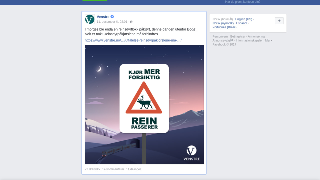 I morges ble enda en reinsdyrflokk påkjørt, denne gangen utenfor Bodø. Nok er nok! Reinsdyrpåkjørslene må forhindres. https://www.venstre.no/artikkel/2017/12/10/uttalelse-reinsdyrpakjorslene-ma-forhindres/