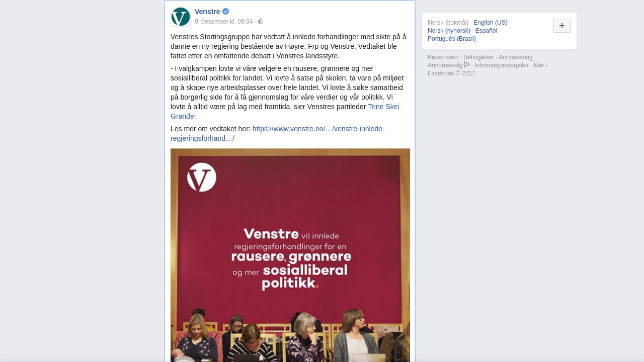 Les mer om vedtaket her: https://www.venstre.no/artikkel/2017/12/09/venstre-innlede-regjeringsforhandlinger-gronnere-rausere-sosialliberal-politikk/