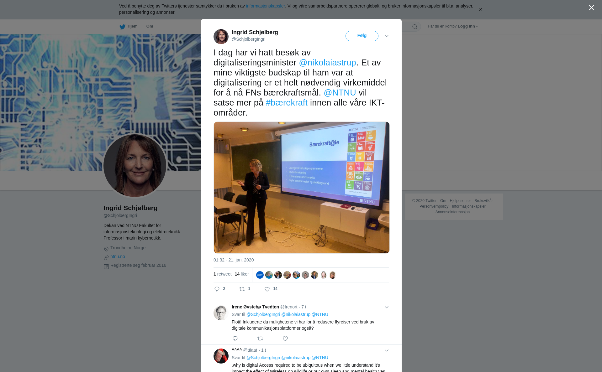 RT @SchjolbergIngri: I dag har vi hatt besøk av digitaliseringsminister @nikolaiastrup. Et av mine viktigste budskap til ham var at digitalisering er et helt nødvendig virkemiddel for å nå FNs bærekraftsmål. @NTNU vil satse mer på #bærekraft innen alle våre IKT-områder. https://t.co/L87MScW34U