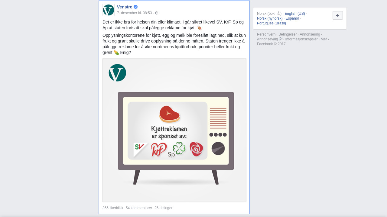 Det er ikke bra for helsen din eller klimaet, i går sikret likevel SV, KrF, Sp og Ap at staten fortsatt skal pålegge reklame for kjøtt 🍖
