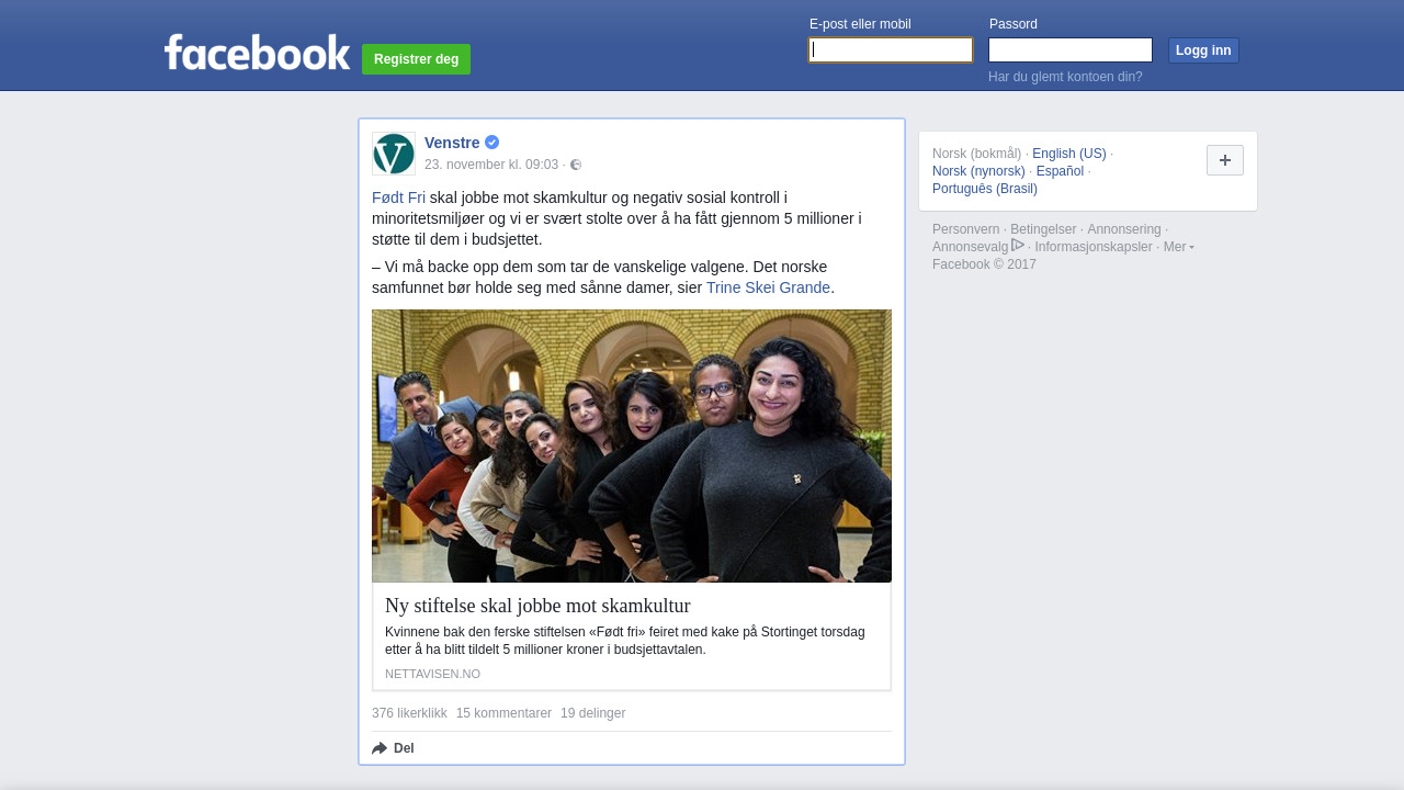 Født Fri skal jobbe mot skamkultur og negativ sosial kontroll i minoritetsmiljøer og vi er svært stolte over å ha fått gjennom 5 millioner i støtte til dem i budsjettet.