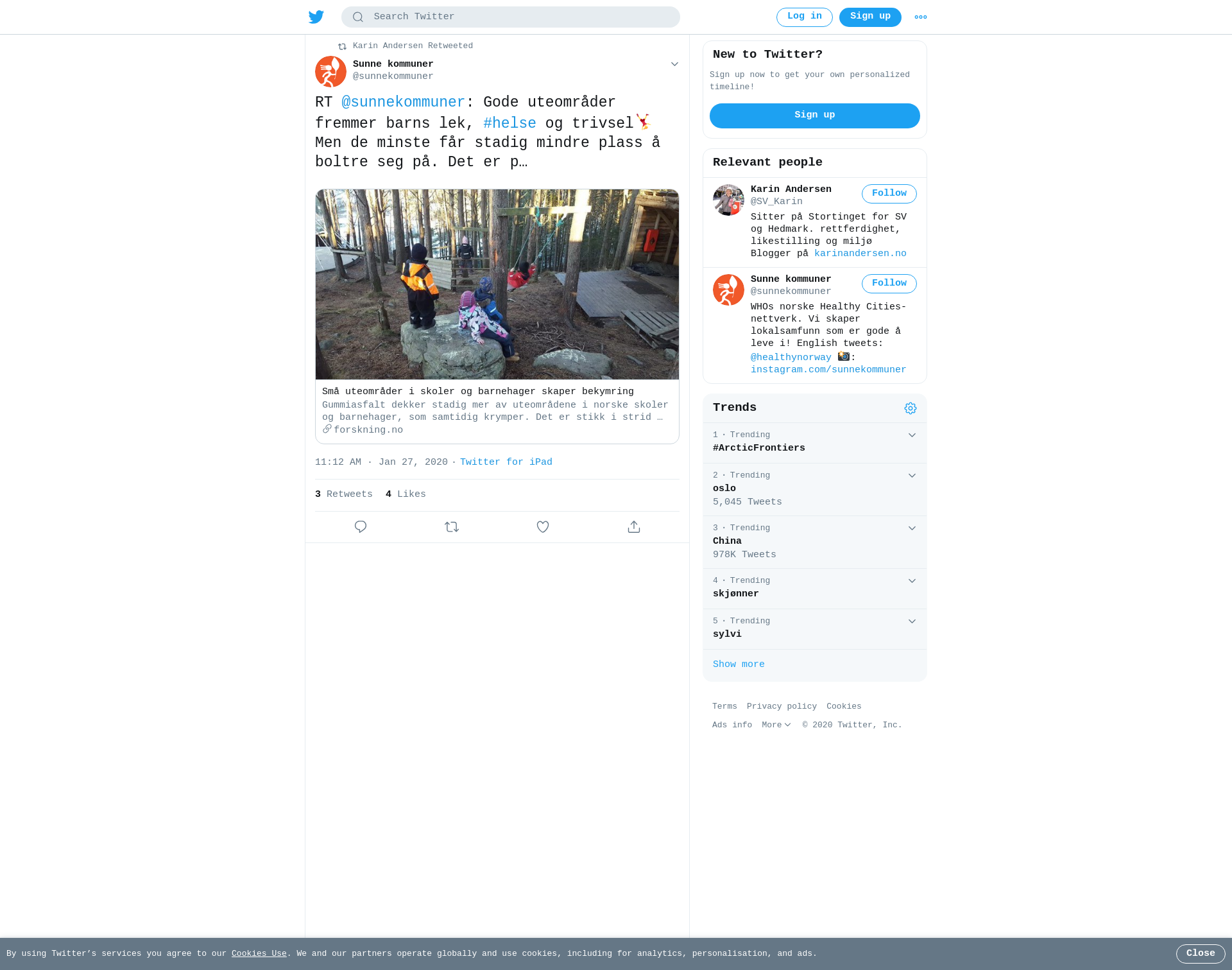 RT @sunnekommuner: Gode uteområder fremmer barns lek, #helse og trivsel🤸♀️ Men de minste får stadig mindre plass å boltre seg på. Det er på tide å ta barnas lekearealer på alvor, mener forsker og landskapsarkitekt fra @UniNMBU👇#dethandleromfolkehelse https://t.co/dCUyByZWDy