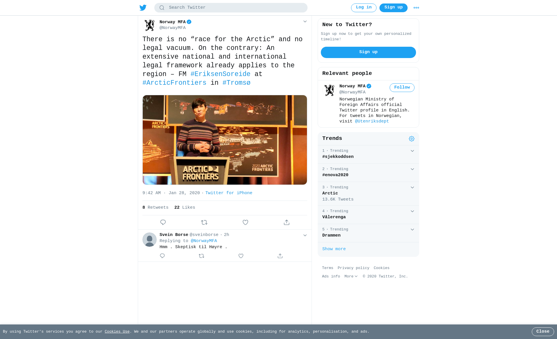 There is no “race for the Arctic” and no legal vacuum. On the contrary: An extensive national and international legal framework already applies to the region – FM #EriksenSoreide at #ArcticFrontiers in #Tromsø https://t.co/feiyEAeJik