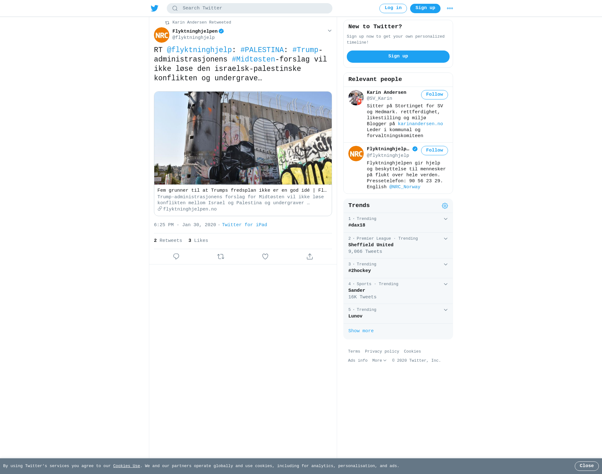RT @flyktninghjelp: #PALESTINA: #Trump-administrasjonens #Midtøsten-forslag vil ikke løse den israelsk-palestinske konflikten og undergraver sjansene for en rettferdig og varig fred.
