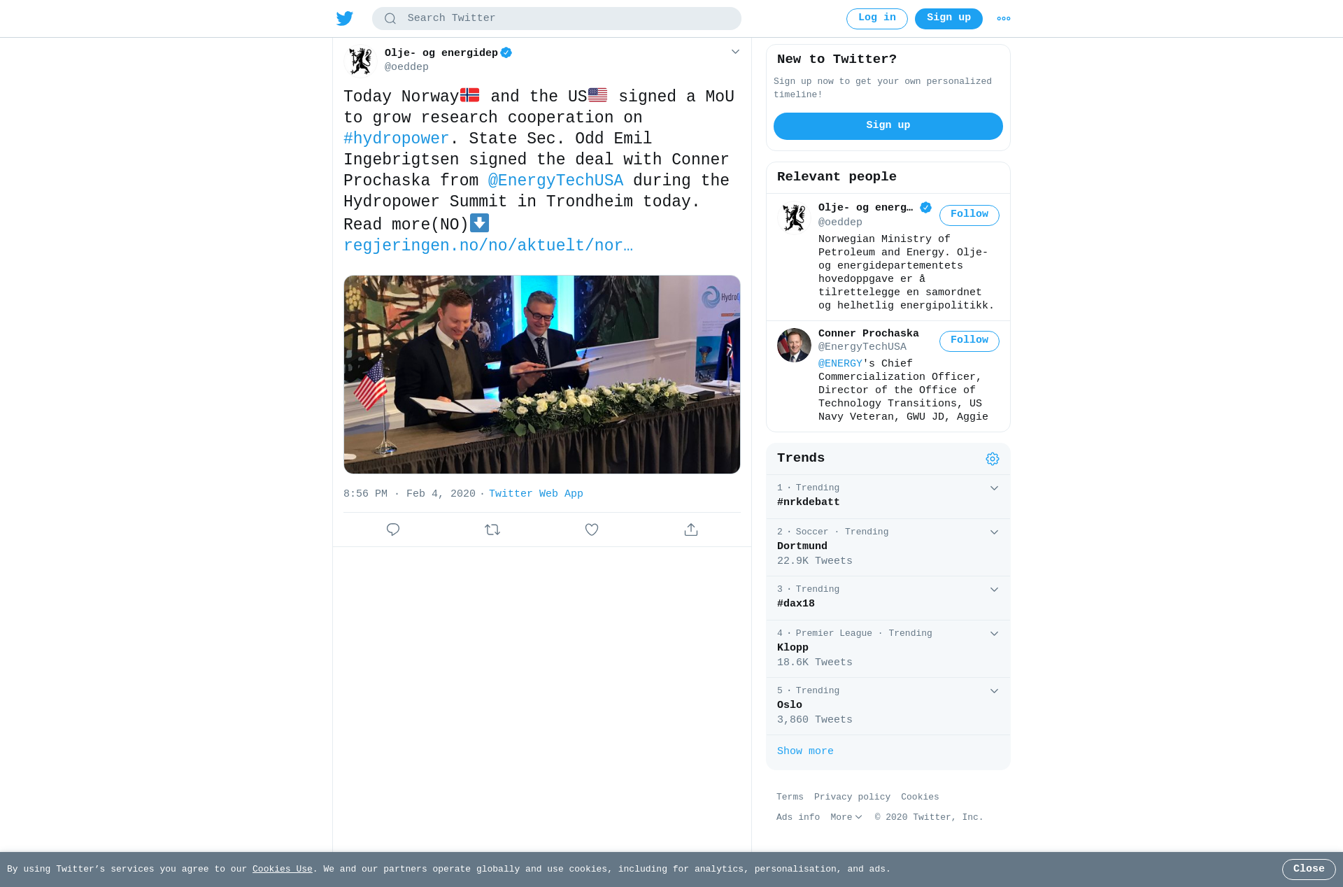 Today Norway🇳🇴 and the US🇺🇸 signed a MoU to grow research cooperation on #hydropower. State Sec. Odd Emil Ingebrigtsen signed the deal with Conner Prochaska from @EnergyTechUSA during the Hydropower Summit in Trondheim today. Read more(NO)⬇️https://t.co/onhh34iWgi https://t.co/kDKe7YE6BM