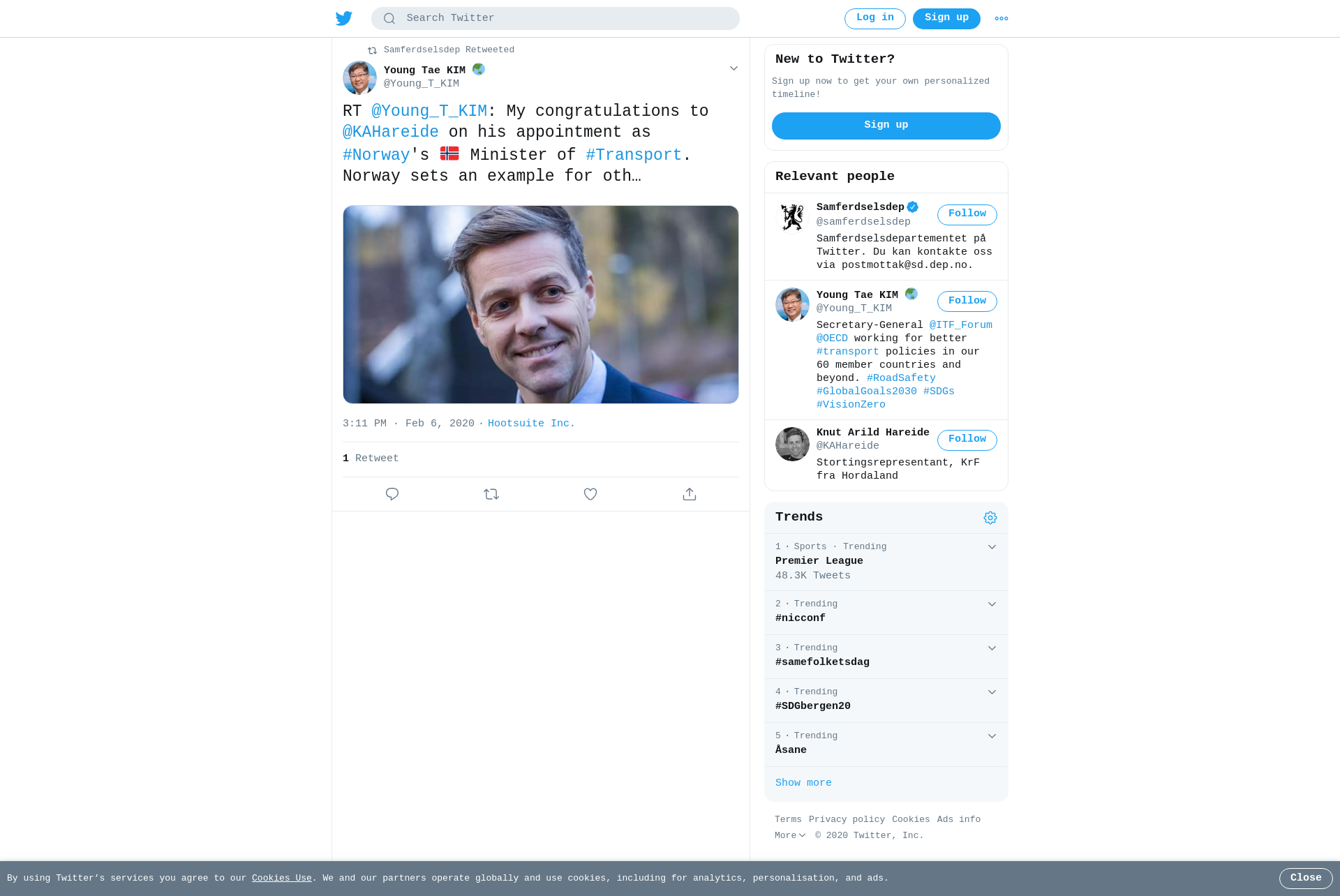 RT @Young_T_KIM: My congratulations to @KAHareide on his appointment as #Norway's 🇳🇴 Minister of #Transport. Norway sets an example for other @ITF_Forum members, notably as a leader in #roadsafety. I look forward to our continued work together. Velkommen !