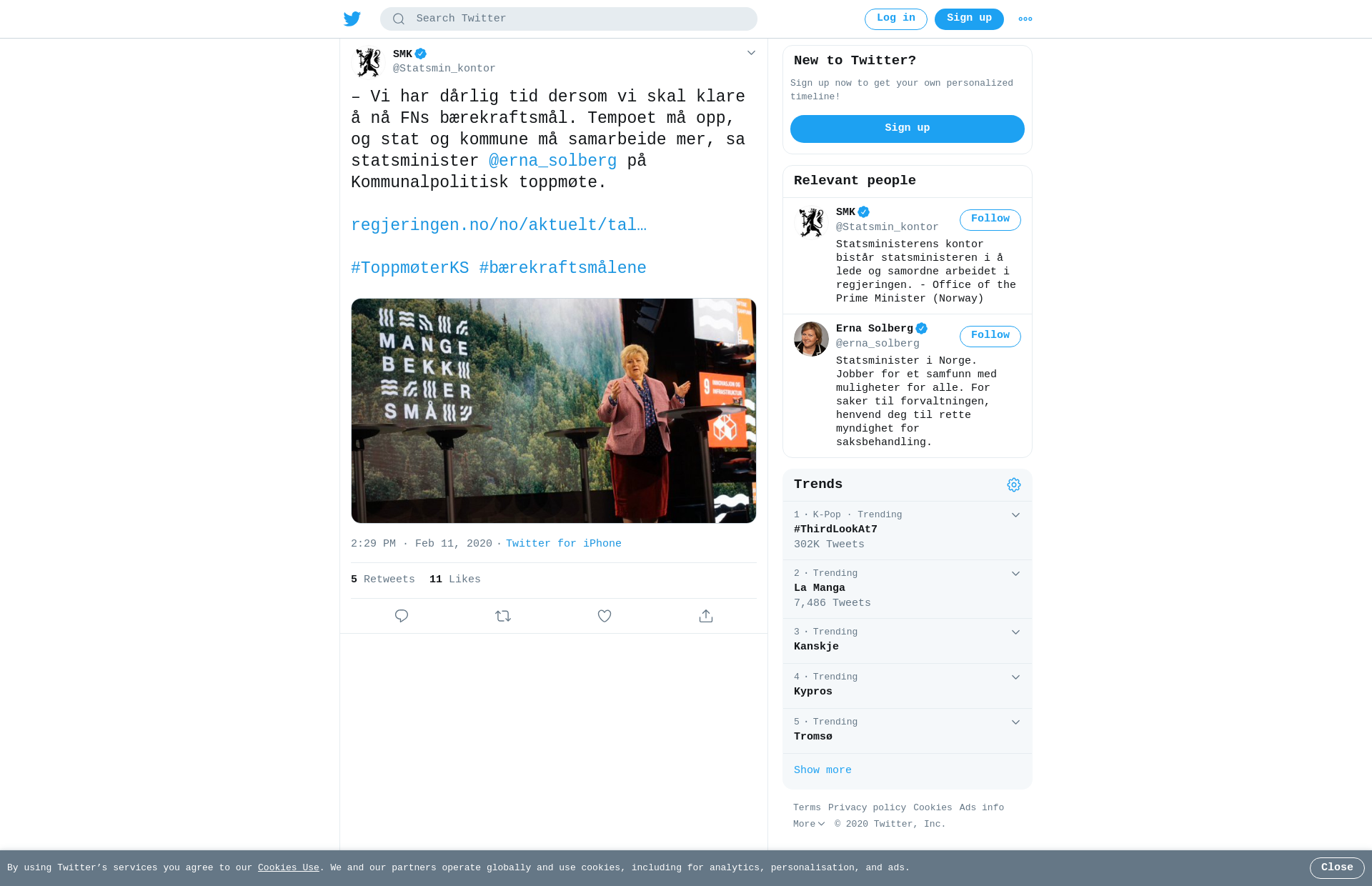 – Vi har dårlig tid dersom vi skal klare å nå FNs bærekraftsmål. Tempoet må opp, og stat og kommune må samarbeide mer, sa statsminister @erna_solberg på Kommunalpolitisk toppmøte.