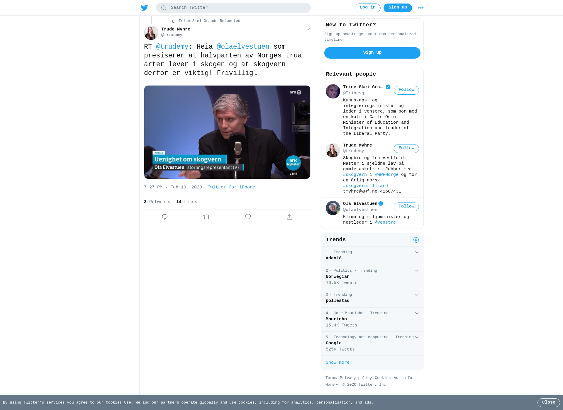 RT @trudemy: Heia @olaelvestuen som presiserer at halvparten av Norges trua arter lever i skogen og at skogvern derfor er viktig! Frivillig skogvern er populært og det godt betalt, så du må øke skogvernbudsjettet for å nå Stortingets mål om 10%, @Rotevatn! 🌱🌿🌳🌲 #dax18 #Verdtåbevare https://t.co/mOjzgnHgHC