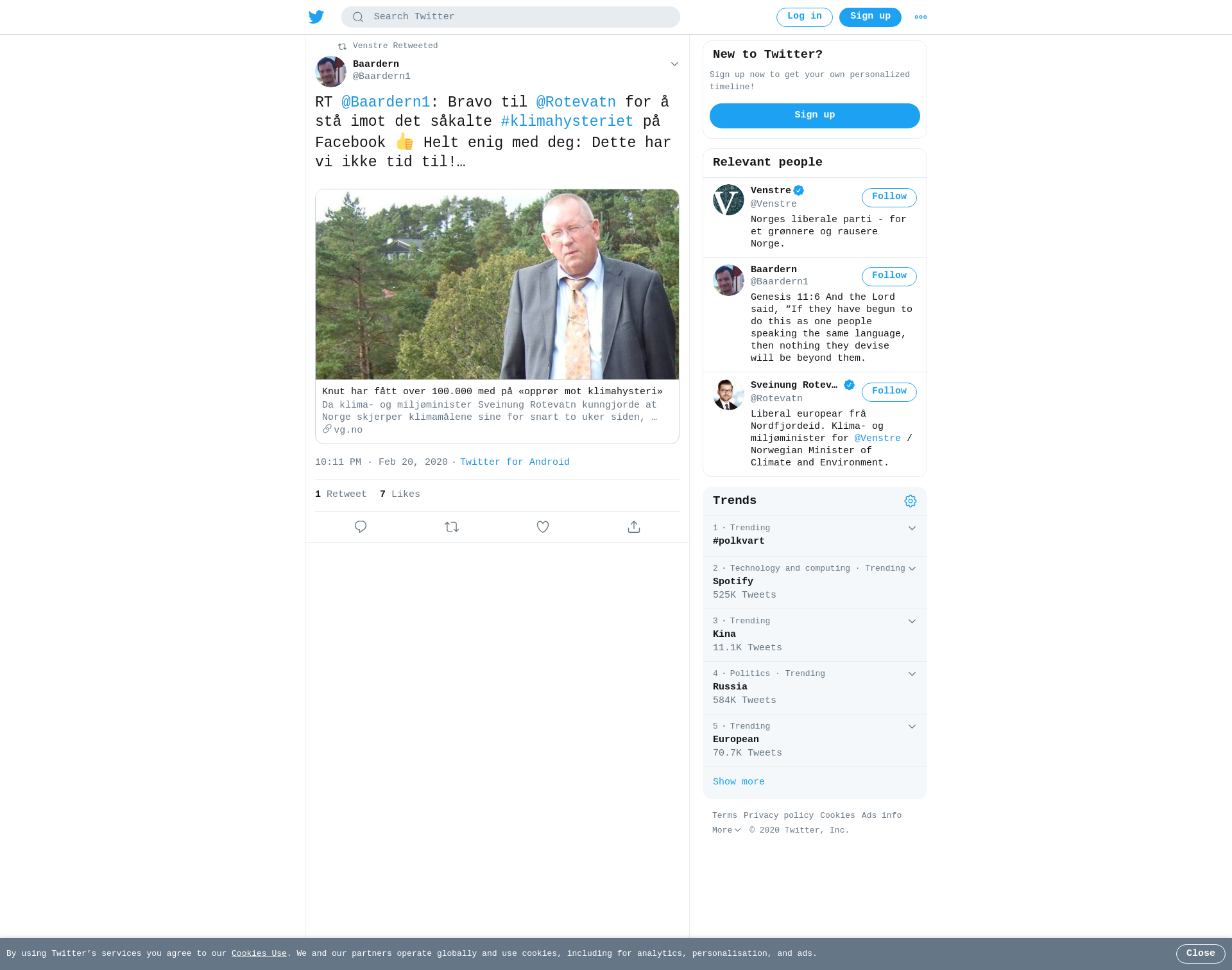 RT @Baardern1: Bravo til @Rotevatn for å stå imot det såkalte #klimahysteriet på Facebook 👍 Helt enig med deg: Dette har vi ikke tid til! #vg @Venstre #klimadebatten https://t.co/J84ynTjol2