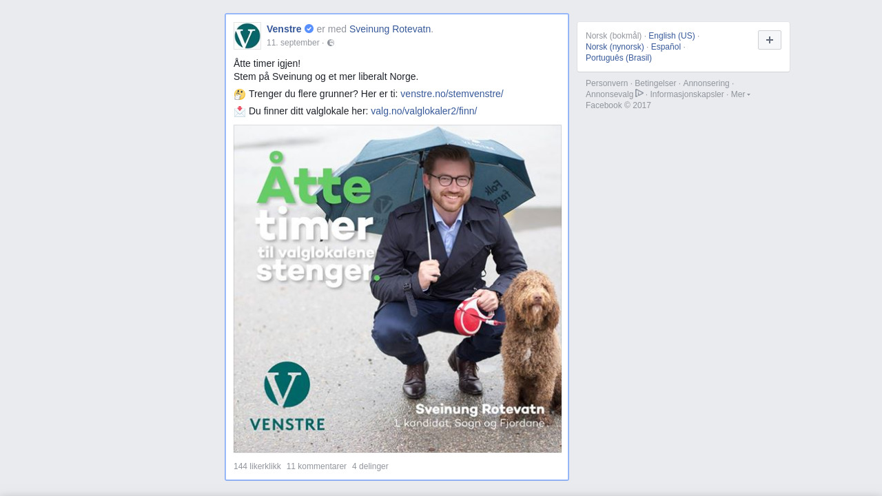 Åtte timer igjen! Stem på Sveinung og et mer liberalt Norge. 🤔 Trenger du flere grunner? Her er ti: venstre.no/stemvenstre/ 📩 Du finner ditt valglokale her: valg.no/valglokaler2/finn/