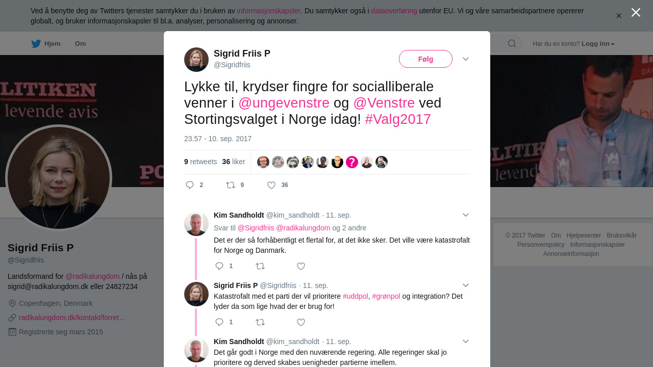 RT @Sigridfriis: Lykke til, krydser fingre for socialliberale venner i @ungevenstre og @Venstre ved Stortingsvalget i Norge idag! #Valg2017