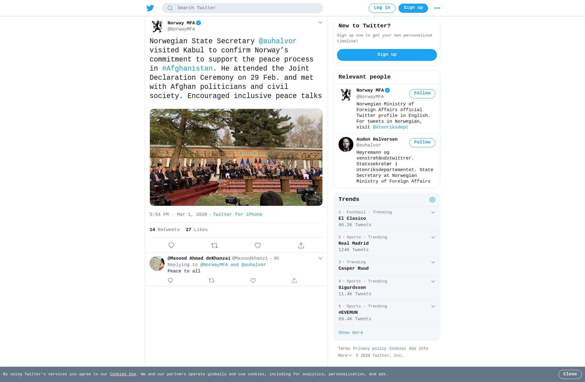 Norwegian State Secretary @auhalvor visited Kabul to confirm Norway’s commitment to support the peace process in #Afghanistan. He attended the Joint Declaration Ceremony on 29 Feb. and met with Afghan politicians and civil society. Encouraged inclusive peace talks https://t.co/R4E0bfpsNa