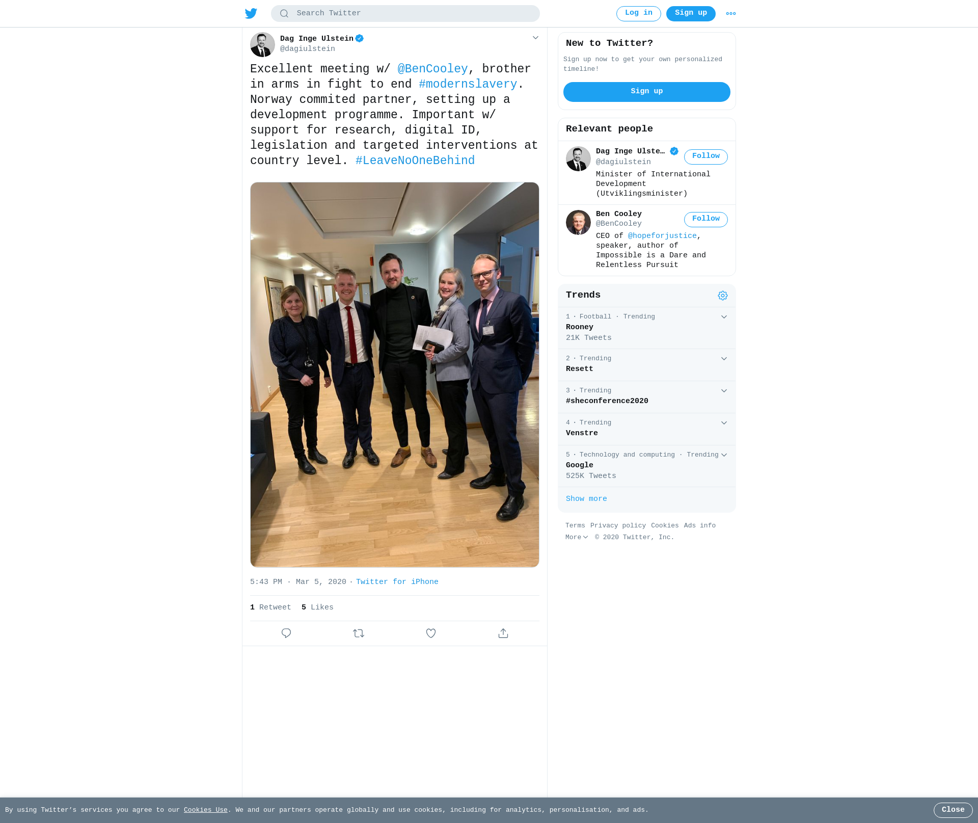 Excellent meeting w/ @BenCooley, brother in arms in fight to end #modernslavery. Norway commited partner, setting up a development programme. Important w/ support for research, digital ID, legislation and targeted interventions at country level. #LeaveNoOneBehind https://t.co/FkqDjDAbHS