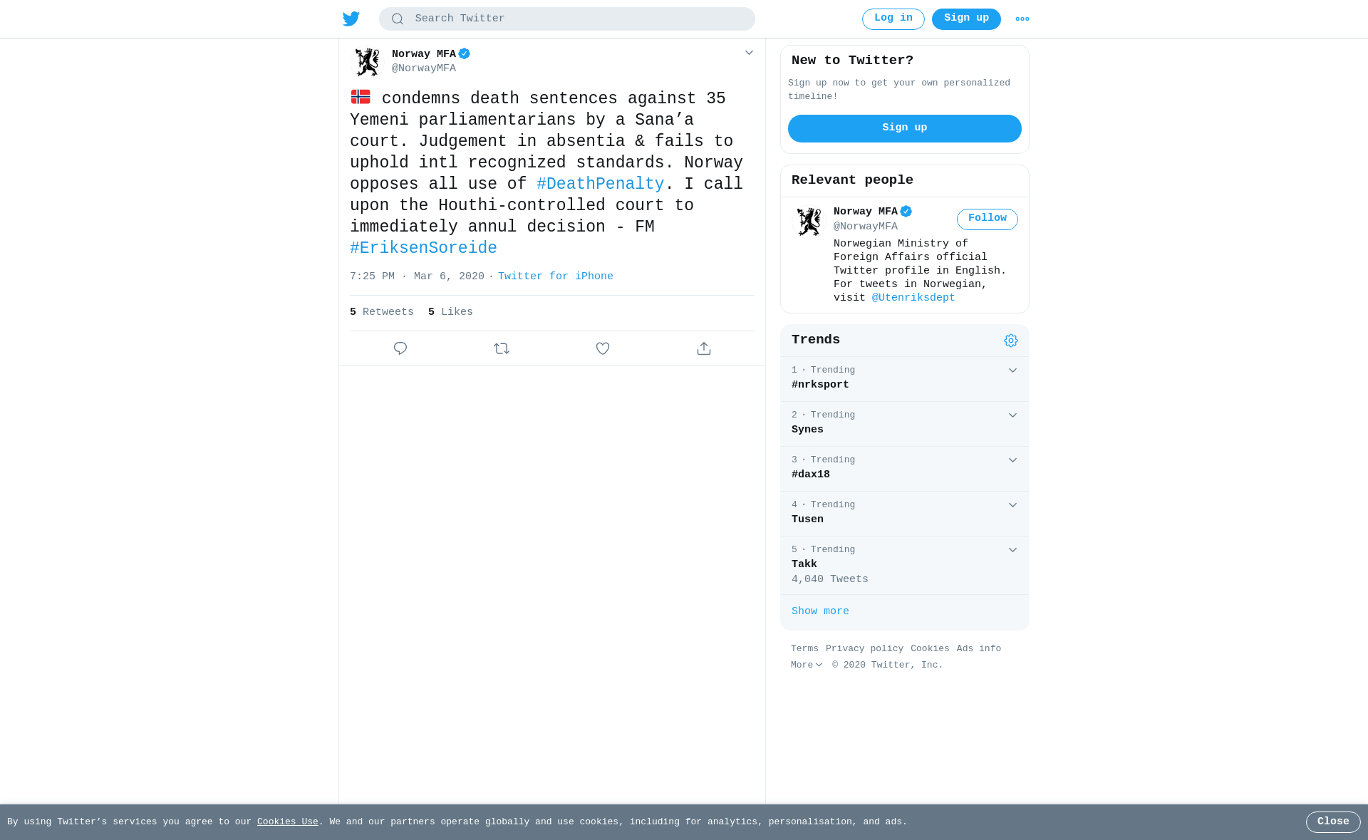 🇳🇴 condemns death sentences against 35 Yemeni parliamentarians by a Sana’a court. Judgement in absentia & fails to uphold intl recognized standards. Norway opposes all use of #DeathPenalty. I call upon the Houthi-controlled court to immediately annul decision - FM #EriksenSoreide