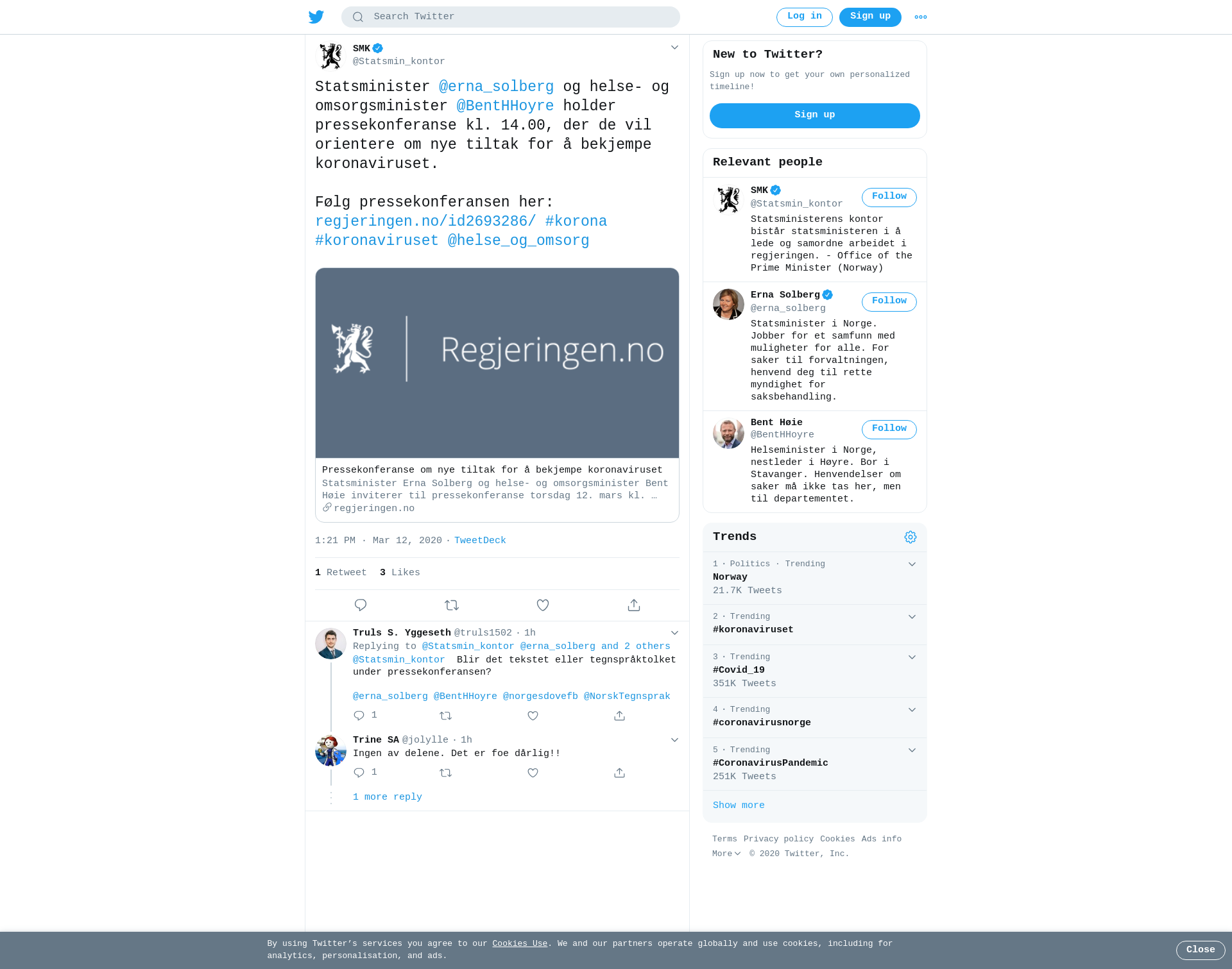 Statsminister Erna Solberg og helse- og omsorgsminister Bent Høie inviterer til pressekonferanse torsdag 12. mars kl. 14.00, der de vil orientere om nye tiltak for å bekjempe koronaviruset.