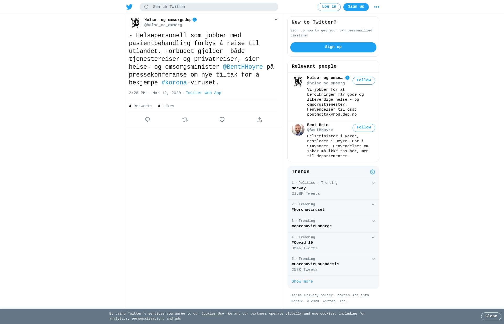 - Helsepersonell som jobber med pasientbehandling forbys å reise til utlandet. Forbudet gjelder både tjenestereiser og privatreiser, sier helse- og omsorgsminister @BentHHoyre på pressekonferanse om nye tiltak for å bekjempe #korona-viruset.