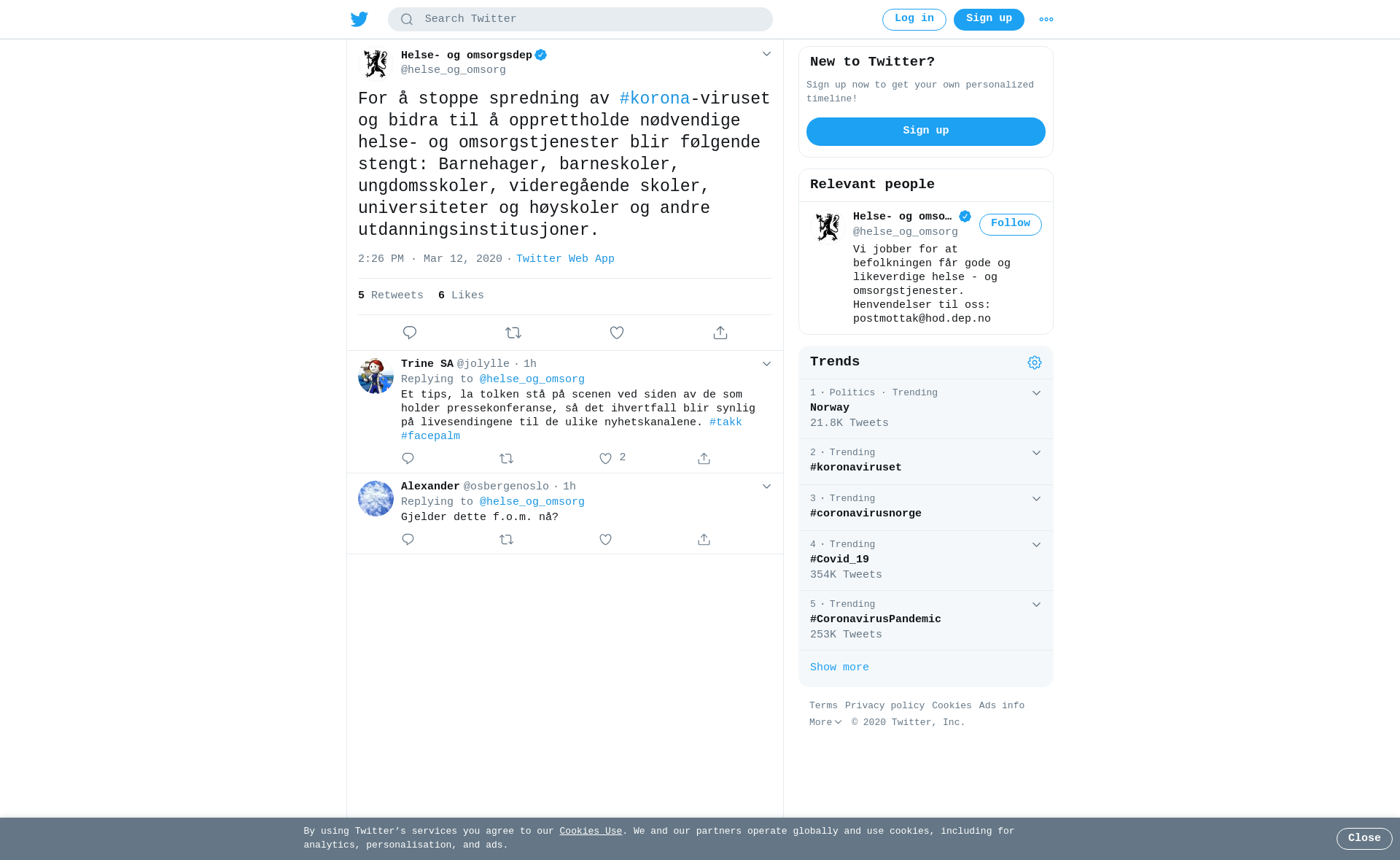 For å stoppe spredning av #korona-viruset og bidra til å opprettholde nødvendige helse- og omsorgstjenester blir følgende stengt: Barnehager, barneskoler, ungdomsskoler, videregående skoler, universiteter og høyskoler og andre utdanningsinstitusjoner.