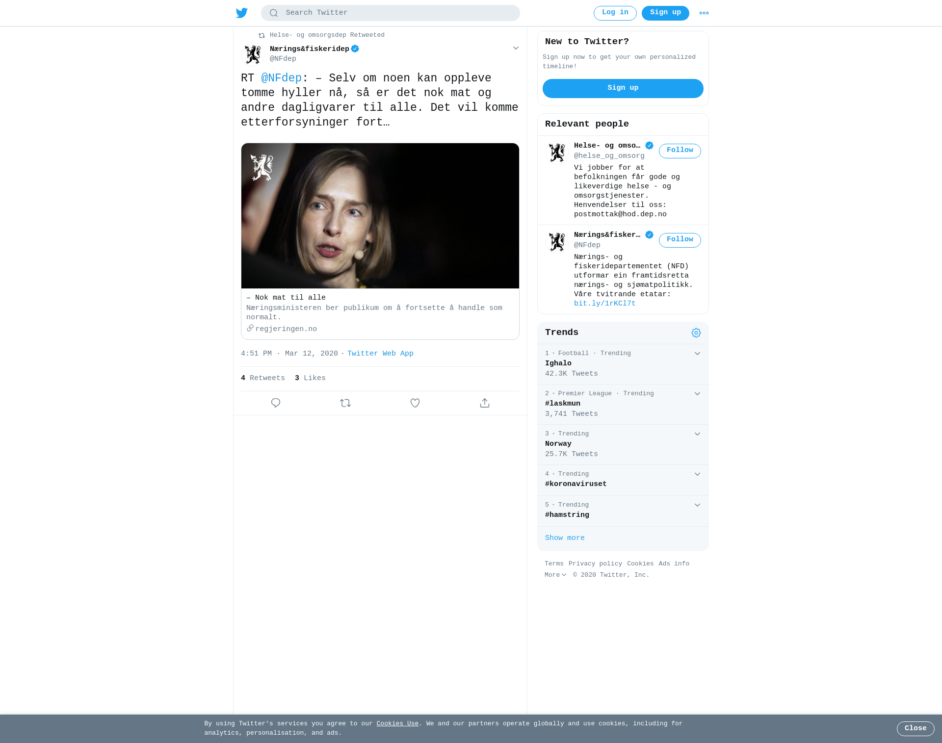 RT @NFdep: – Selv om noen kan oppleve tomme hyller nå, så er det nok mat og andre dagligvarer til alle. Det vil komme etterforsyninger fortløpende. Vi følger situasjonen tett, sier næringsminister @IselinNybo #koronaviruset https://t.co/ggfuulNxpf