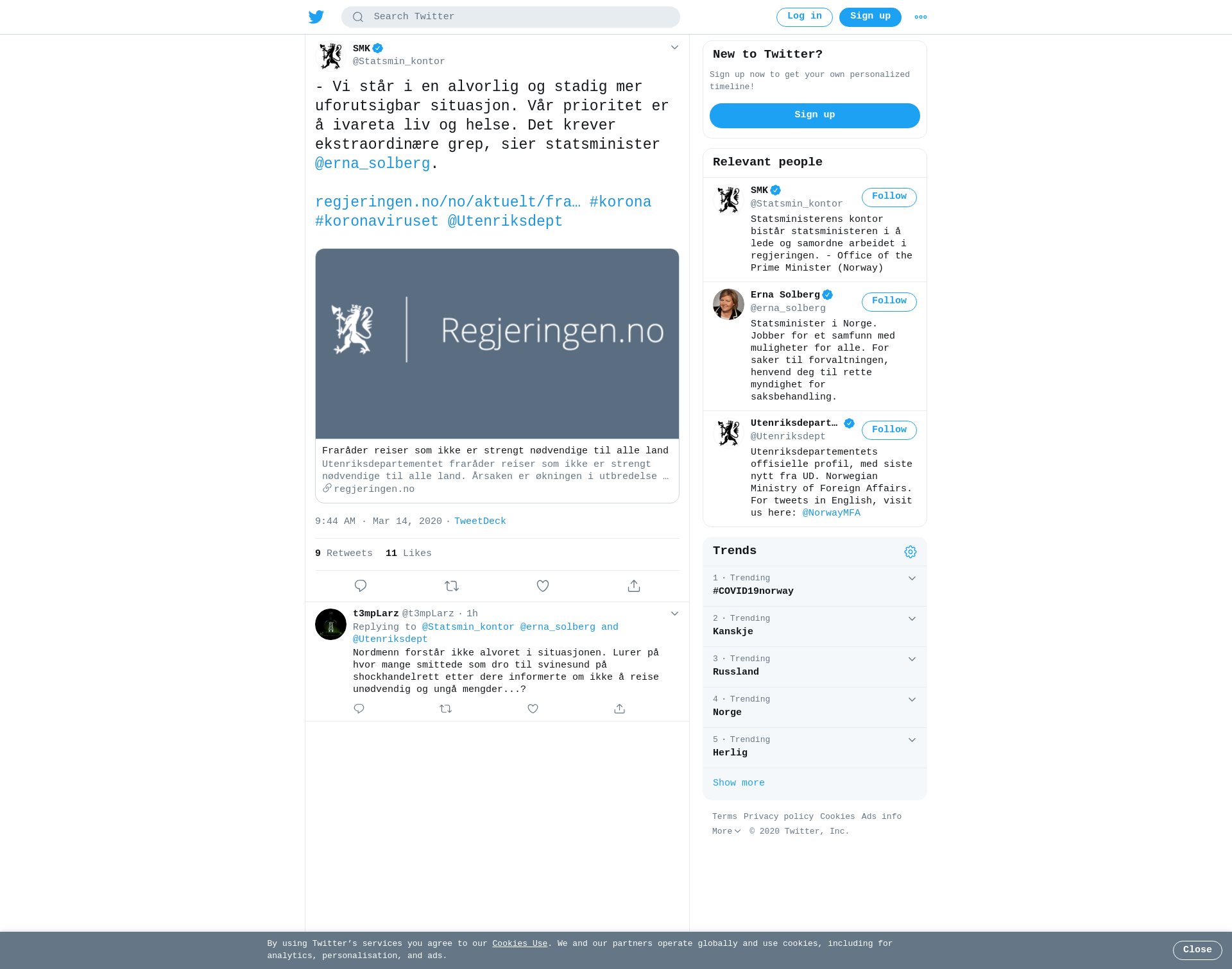 Utenriksdepartementet fraråder reiser som ikke er strengt nødvendige til alle land. Årsaken er økningen i utbredelse av koronaviruset internasjonalt og den uforutsigbare og vanskelige situasjonen for mange reisende. Reiserådet gjelder i første omgang t...