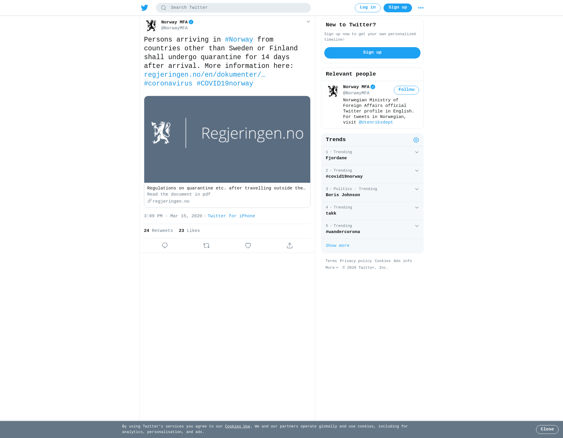 Persons arriving in #Norway from countries other than Sweden or Finland shall undergo quarantine for 14 days after arrival. More information here: https://t.co/JaSPtwtmA2 #coronavirus #COVID19norway