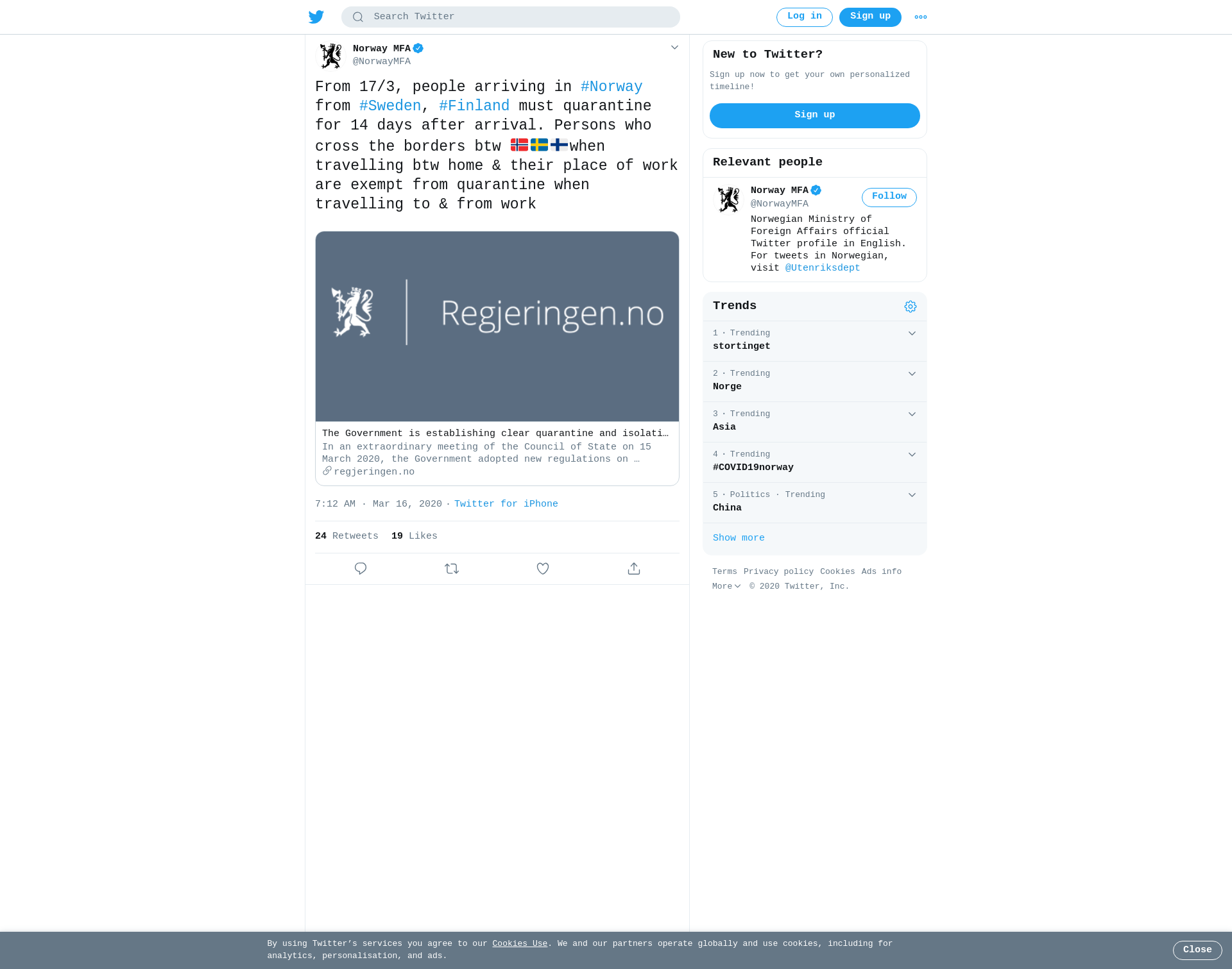 From 17/3, people arriving in #Norway from #Sweden, #Finland must quarantine for 14 days after arrival. Persons who cross the borders btw 🇳🇴🇸🇪🇫🇮when travelling btw home & their place of work are exempt from quarantine when travelling to & from work https://t.co/VpRtmhoSMz