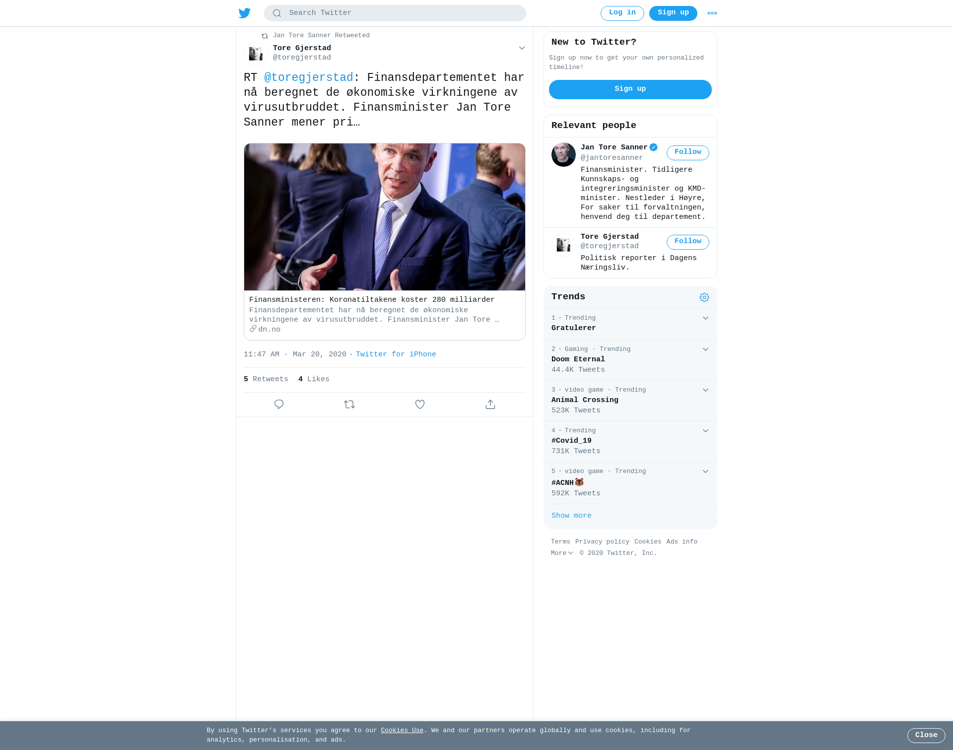 RT @toregjerstad: Finansdepartementet har nå beregnet de økonomiske virkningene av virusutbruddet. Finansminister Jan Tore Sanner mener prisen for nedstengingen av Norge ikke er for høy. https://t.co/9NXxKZeDLI