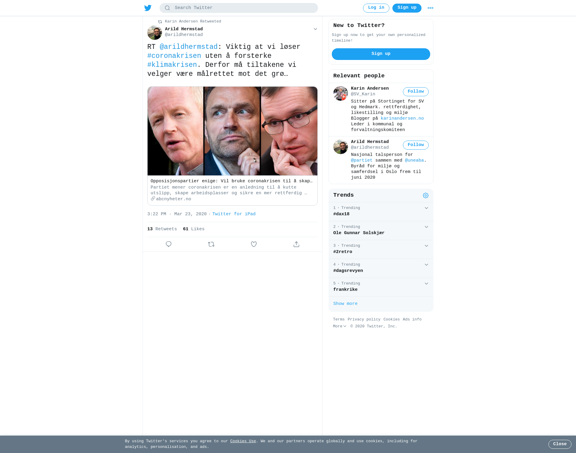 RT @arildhermstad: Viktig at vi løser #coronakrisen uten å forsterke #klimakrisen. Derfor må tiltakene vi velger være målrettet mot det grønne skiftet, og ikke sikte mot å gjenopprette en ikke-bærekraftig økonomi, https://t.co/q0i2GfMHJJ