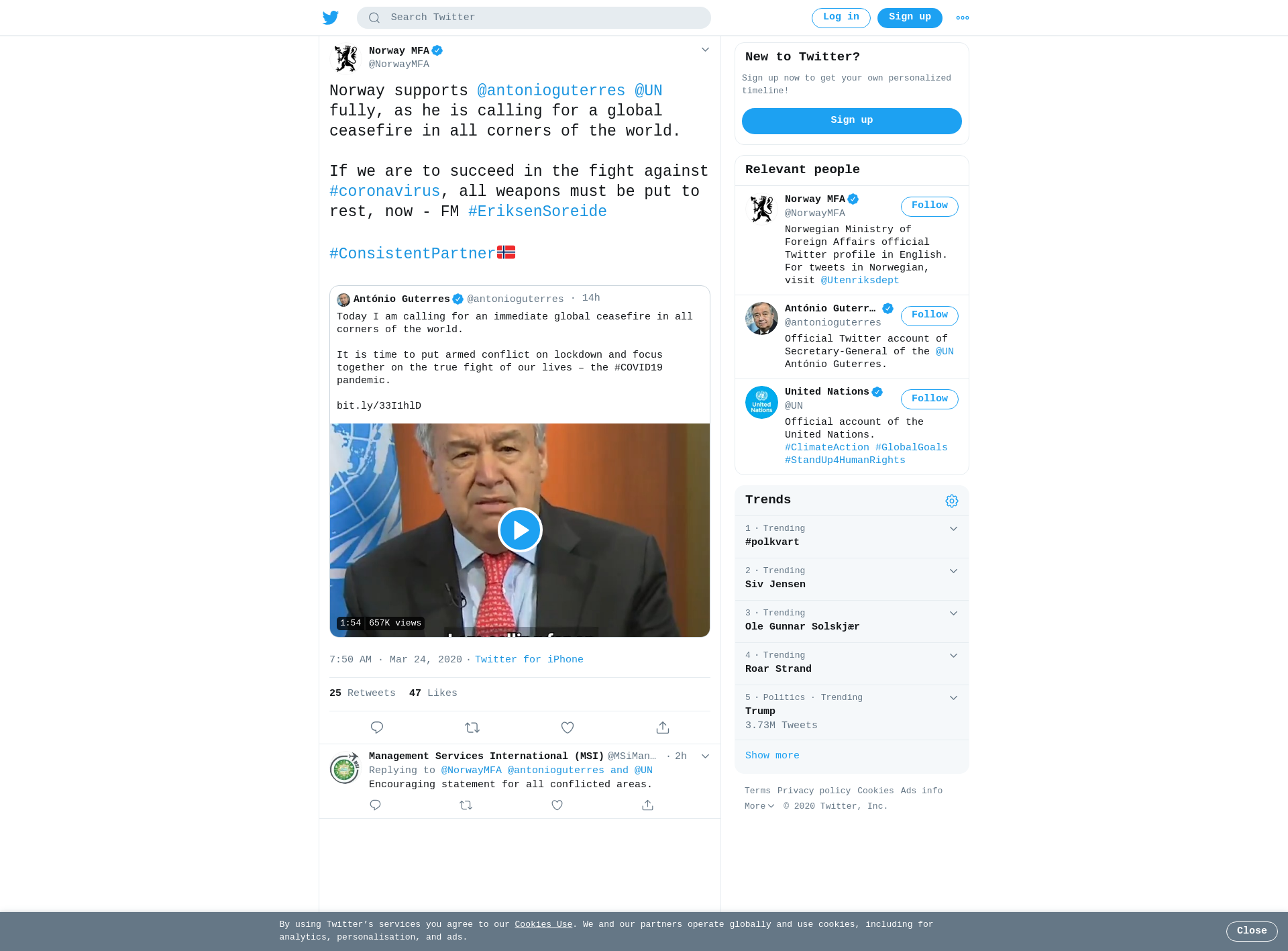 Norway supports @antonioguterres @UN fully, as he is calling for a global ceasefire in all corners of the world.