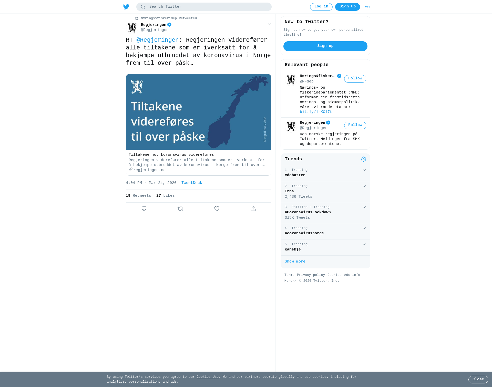 RT @Regjeringen: Regjeringen viderefører alle tiltakene som er iverksatt for å bekjempe utbruddet av koronavirus i Norge frem til over påske, til og med 13. april.