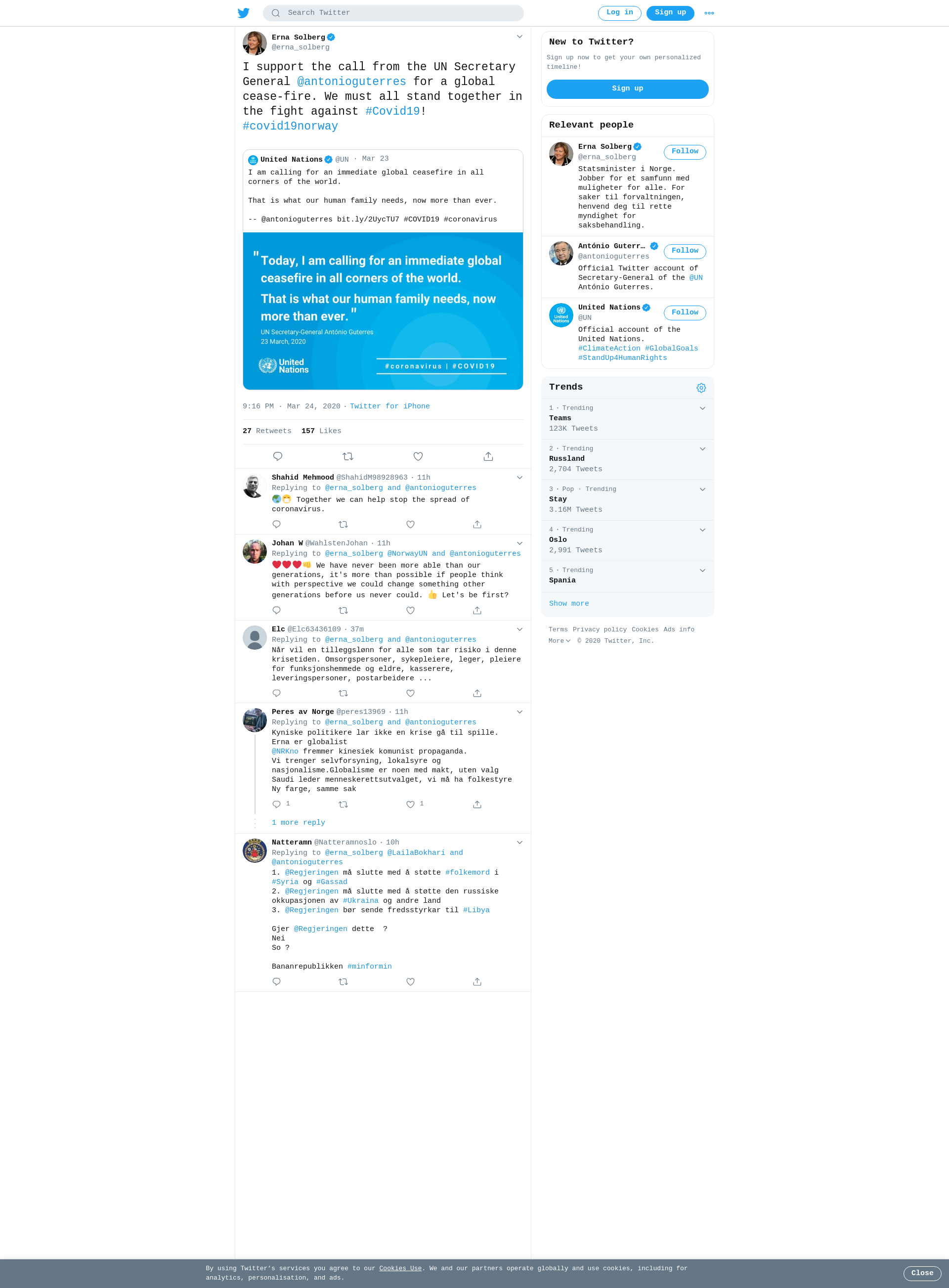 I support the call from the UN Secretary General @antonioguterres for a global cease-fire. We must all stand together in the fight against #Covid19! #covid19norway