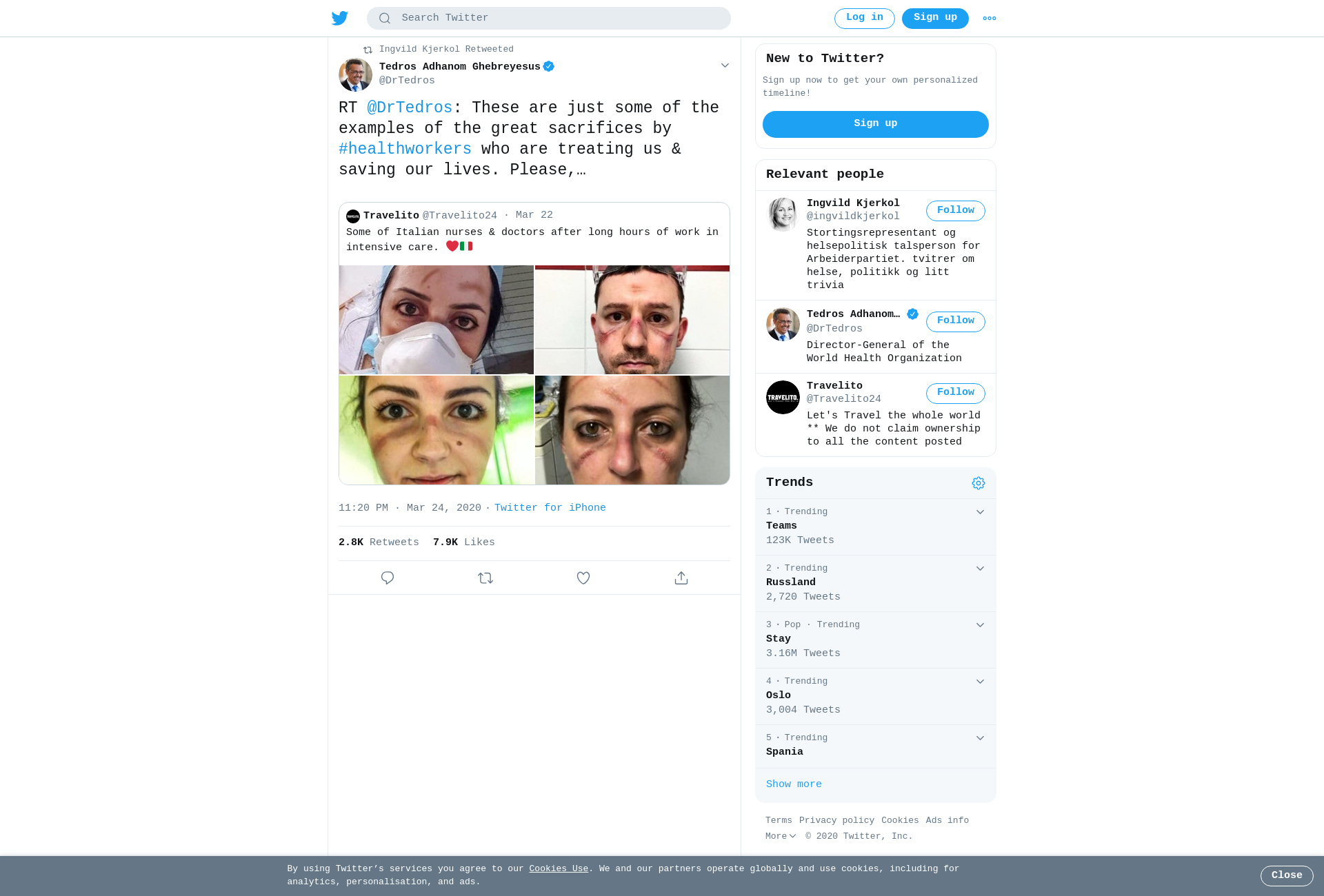 RT @DrTedros: These are just some of the examples of the great sacrifices by #healthworkers who are treating us & saving our lives. Please, let's do our part: wash your hands, cover your coughs, #StayHome when asked or if you don't feel well; don't wear a mask if you're healthy. #COVID19
