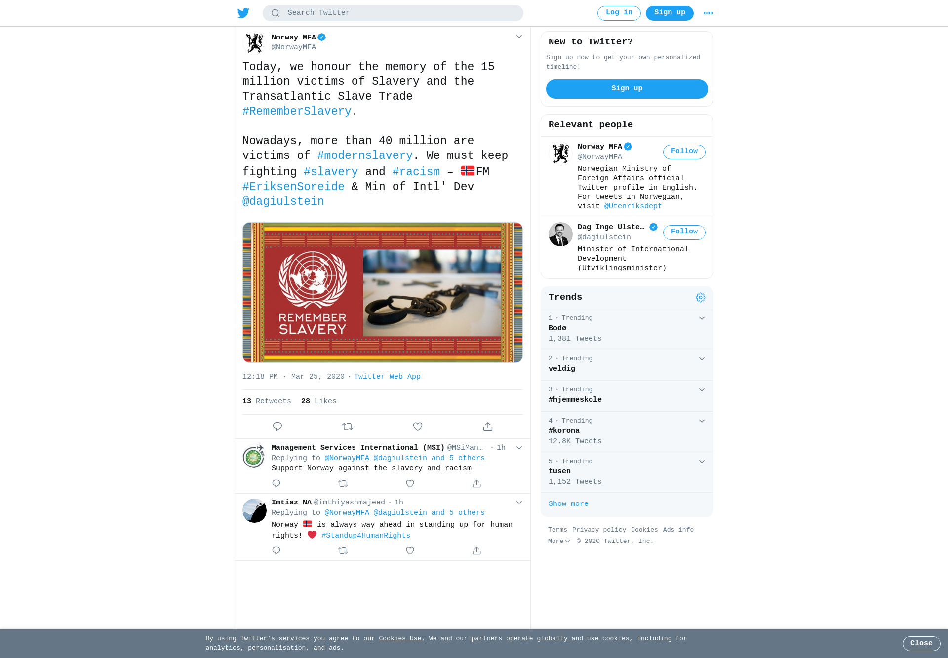 Nowadays, more than 40 million are victims of #modernslavery. We must keep fighting #slavery and #racism – 🇳🇴FM #EriksenSoreide & Min of Intl' Dev @dagiulstein https://t.co/kIX1MGaWQU