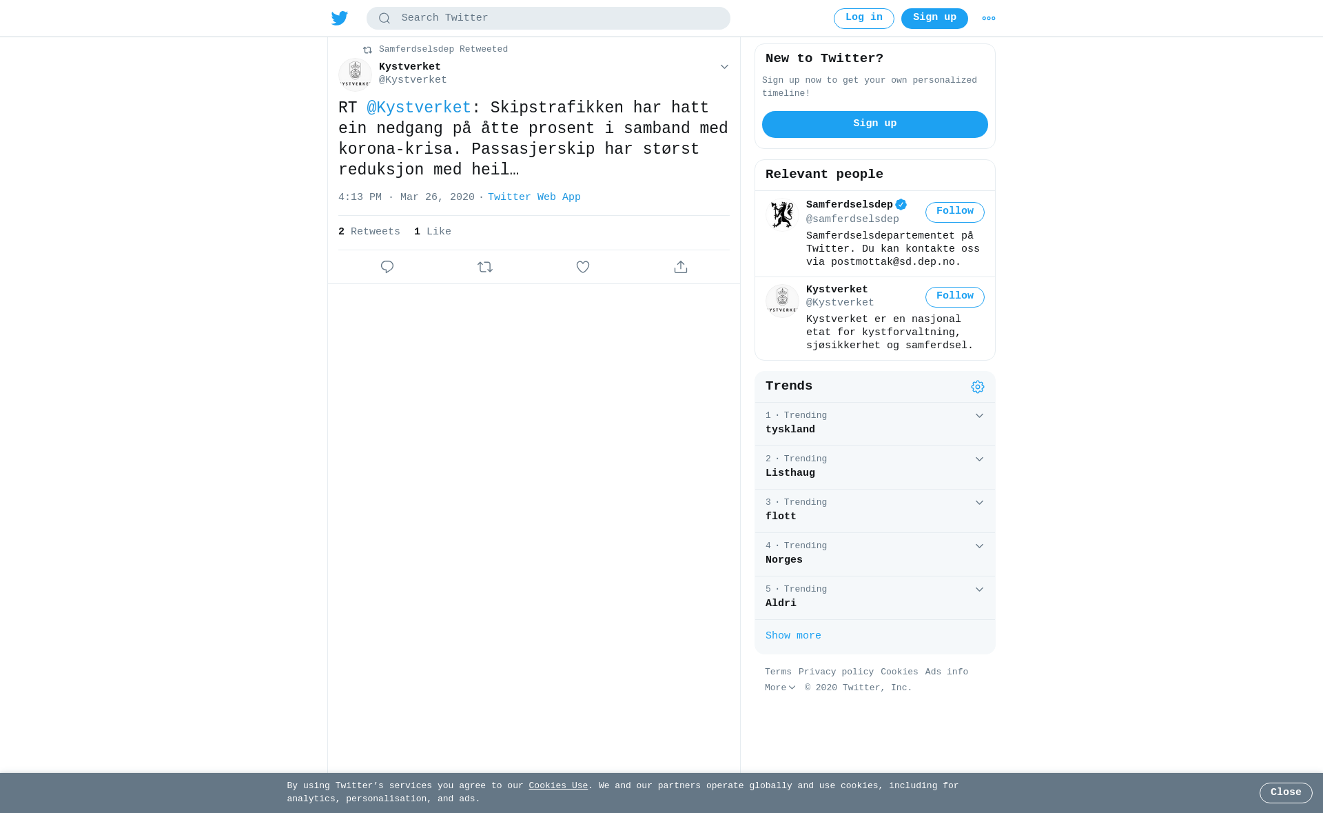 RT @Kystverket: Skipstrafikken har hatt ein nedgang på åtte prosent i samband med korona-krisa. Passasjerskip har størst reduksjon med heile 76 prosent nedgang, noko som utgjer 121 færre skipsanløp. Godstransporten går som normalt. https://t.co/45kGo6DfEj #korona #godstransport @tumaritim