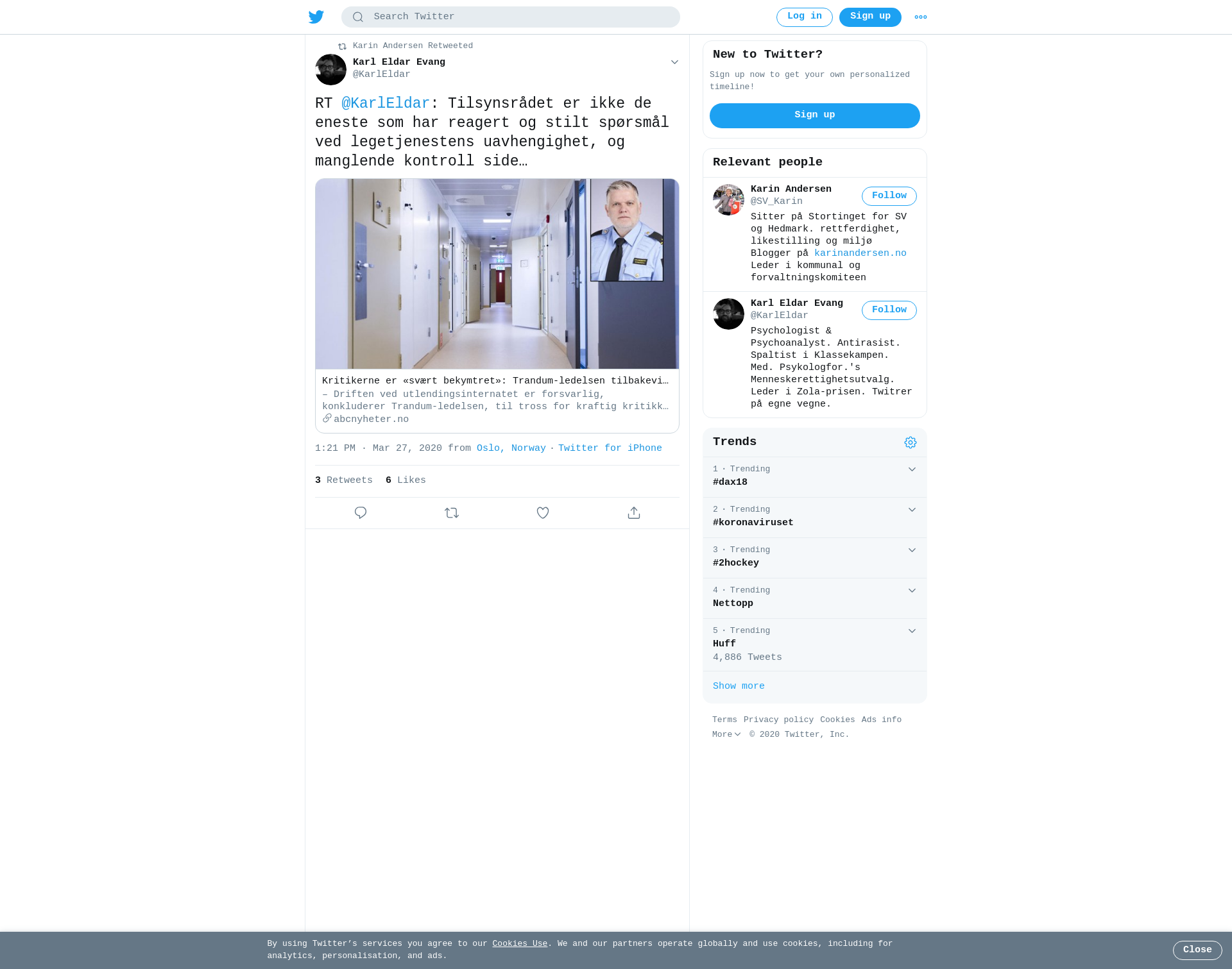 RT @KarlEldar: Tilsynsrådet er ikke de eneste som har reagert og stilt spørsmål ved legetjenestens uavhengighet, og manglende kontroll siden tilbudet ligger utenfor det offentlige helsevesenet. #Trandum https://t.co/Rt9d4Bk4dt