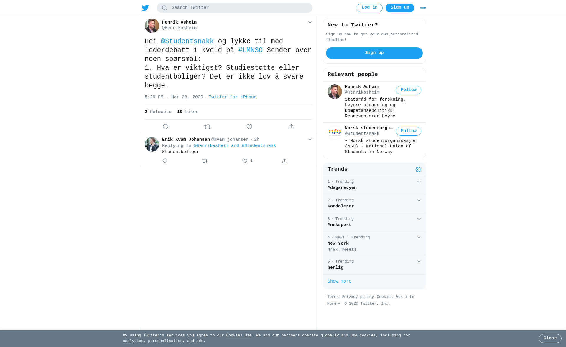 Hei @Studentsnakk og lykke til med lederdebatt i kveld på #LMNSO Sender over noen spørsmål: 1. Hva er viktigst? Studiestøtte eller studentboliger? Det er ikke lov å svare begge.