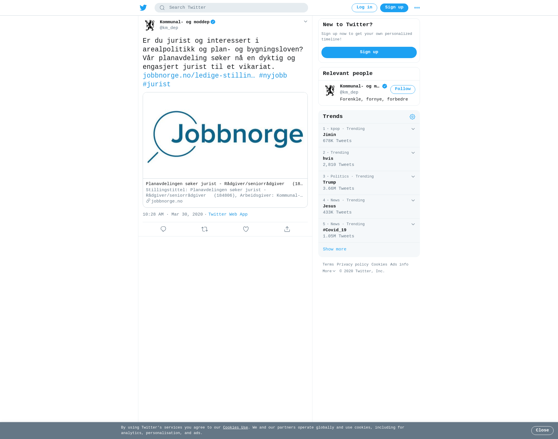 Stillingstittel: Planavdelingen søker jurist - Rådgiver/seniorrådgiver (184806), Arbeidsgiver: Kommunal- og moderniseringsdepartementet, Søknadsfrist: 19. april 2020