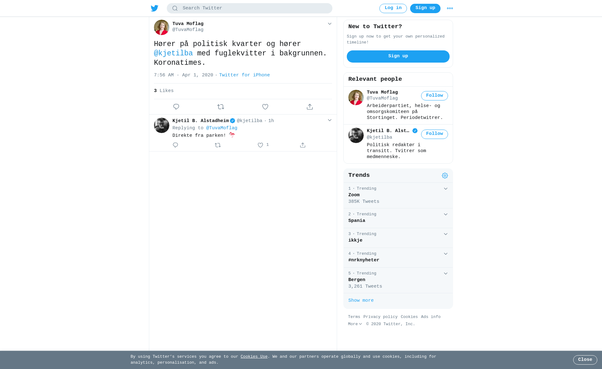 Hører på politisk kvarter og hører @kjetilba med fuglekvitter i bakgrunnen. Koronatimes.