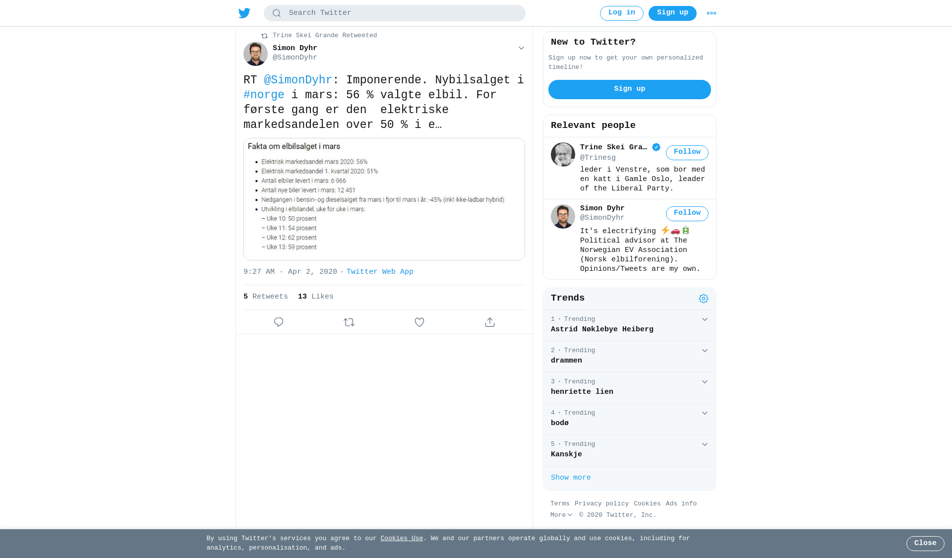 RT @SimonDyhr: Imponerende. Nybilsalget i #norge i mars: 56 % valgte elbil. For første gang er den elektriske markedsandelen over 50 % i et helt kvartal. Gratulerer til alle de nye elbileiere 🇳🇴🚗🔋👏💪#elbil