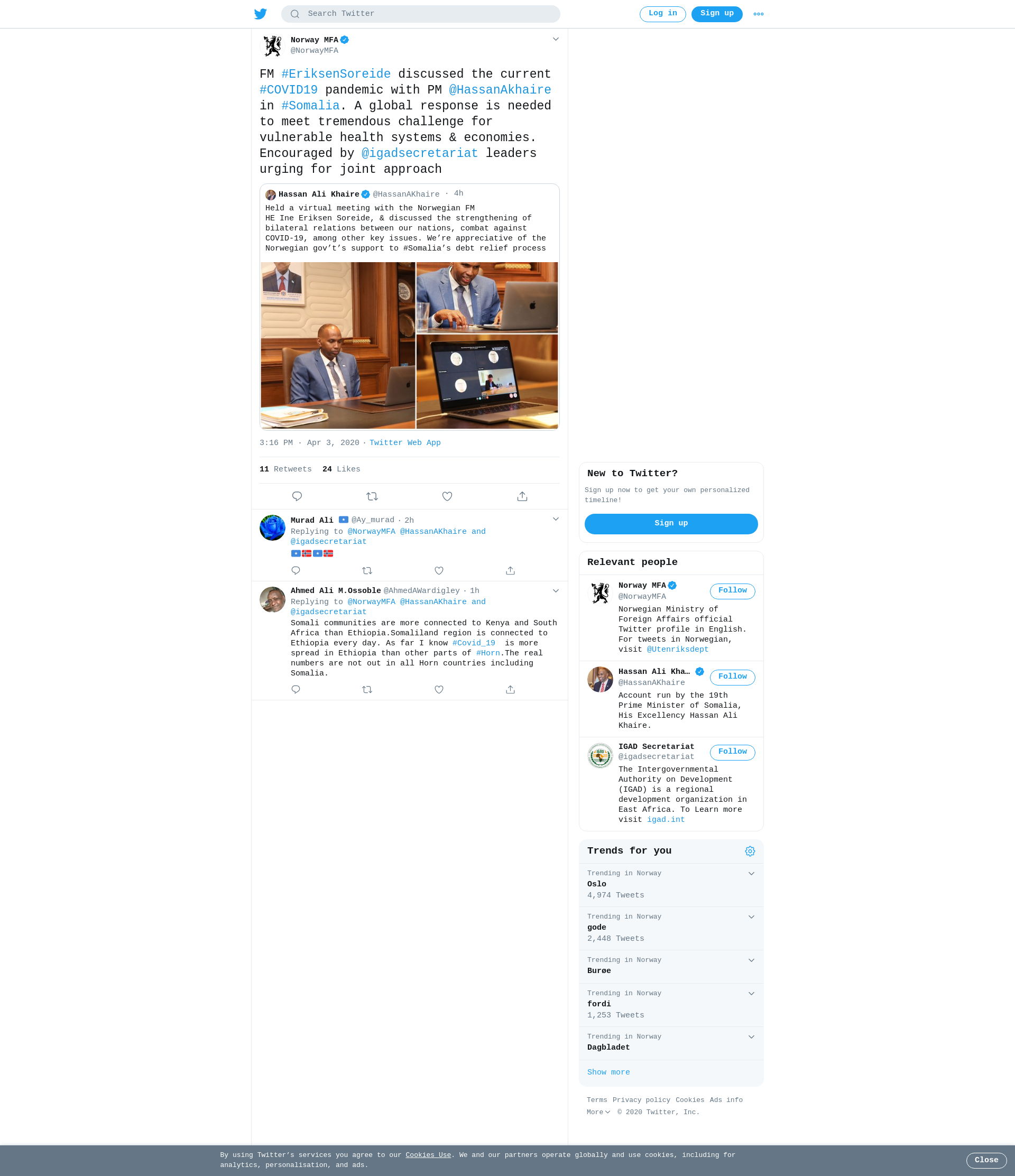 FM #EriksenSoreide discussed the current #COVID19 pandemic with PM @HassanAkhaire in #Somalia. A global response is needed to meet tremendous challenge for vulnerable health systems & economies. Encouraged by @igadsecretariat leaders urging for joint approach